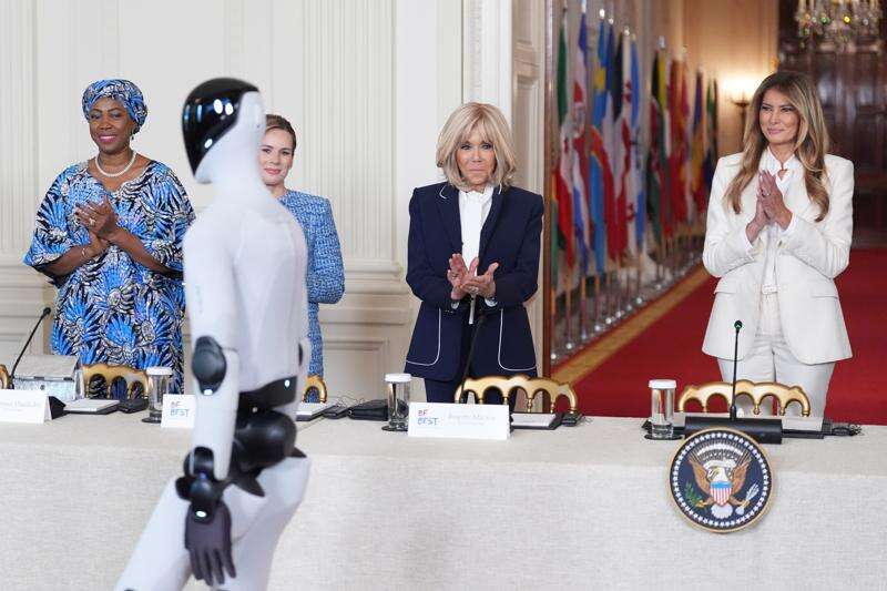 Melania Trump and the humanoid walked slowly side by side along the red carpet from the opposite end of the hallway. The first lady paused just before entering the East Room while the robot walked around the table with the panelists and took up a position in the center of the room.