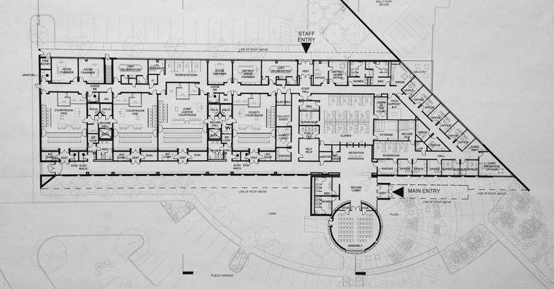 There will be separate staff and public bathrooms, probation offices, jury deliberation rooms, judges chambers; public file room, family court area, workrooms, break rooms, information technology office, mail room, collections and investigations office and storage areas.