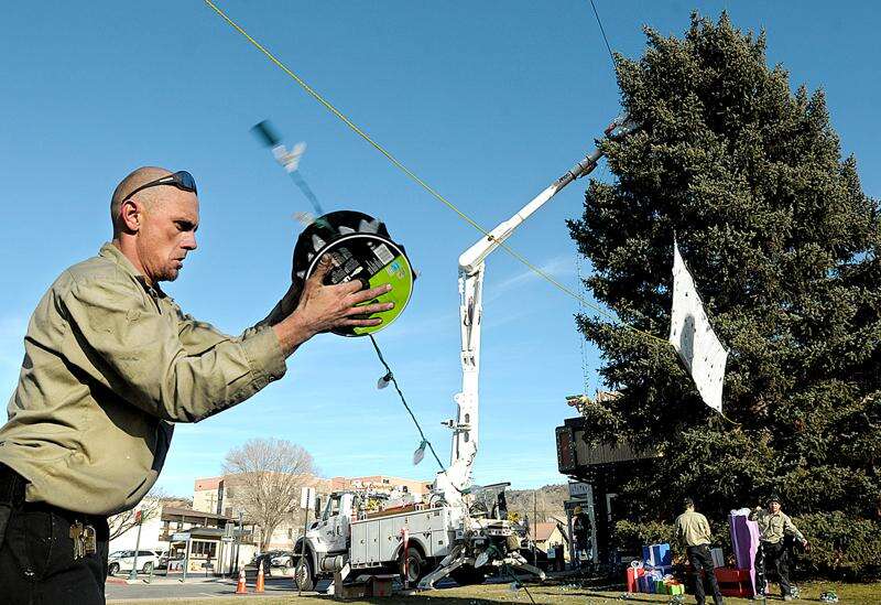 La Plata Electric Association installed about 3,000 light-emitting diode lights Wednesday on a tree next to the Gaslight Twin Cinema. Randy Thrower, with Jackson and Jackson, owner of the property, helped with the effort.