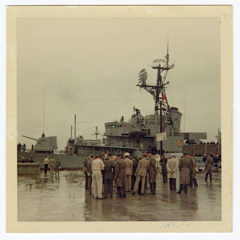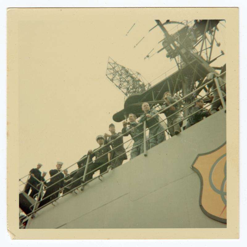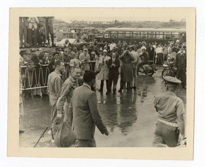 McQueeney's widow donated the photos, which show Armstrong and Scott on the deck of a U.S. Navy vessel and waving to service members on land. One shows the Gemini 8 capsule being lifted into the air for transport.