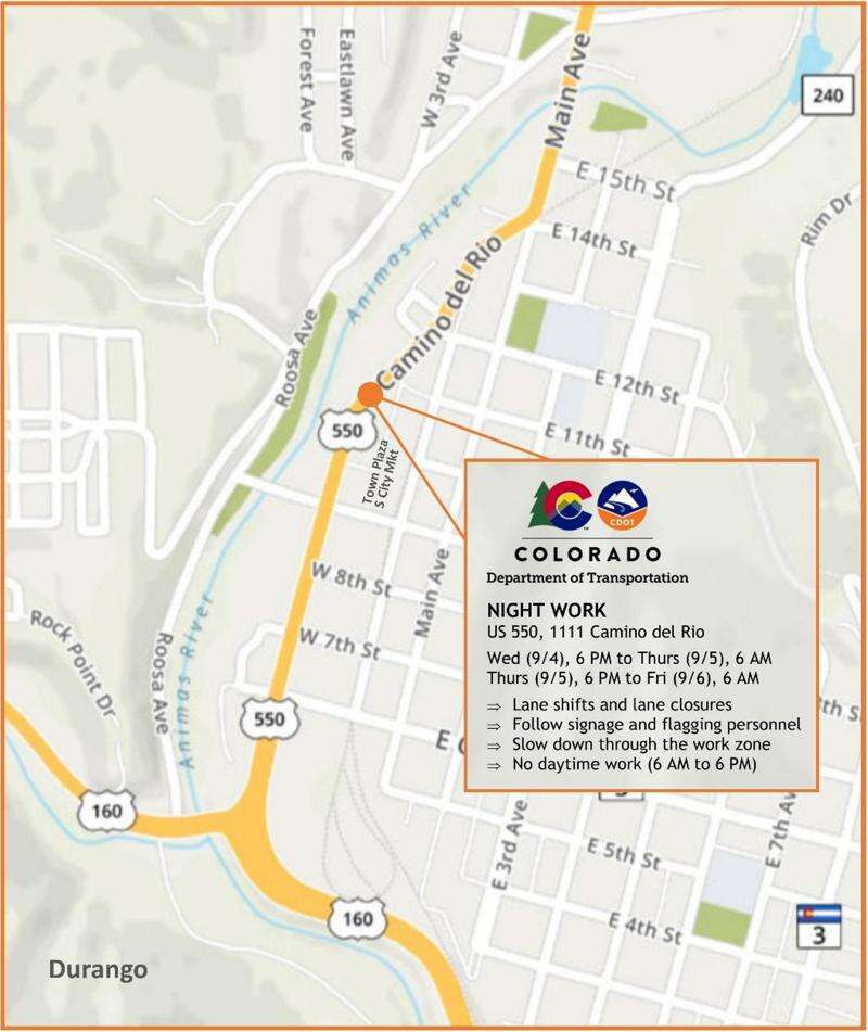 The Colorado Department of Transportation will begin two nights’ work Wednesday on U.S. Highway 550 (Camino del Rio), near Town Plaza in Durango.