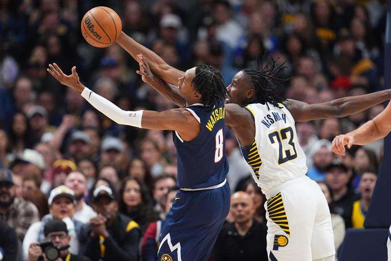 Denver Nuggets guard Peyton Watson, left, and Indiana Pacers forward Aaron Nesmith fight for control of a rebound in the first half of an NBA basketball game Saturday, Nov. 8, 2025, in Denver. (AP Photo/David Zalubowski)