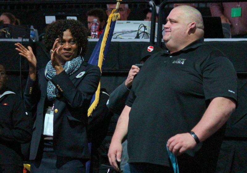 Former Team USA Greco-Roman heavyweight great Rulon Gardner - a gold medalist at the 2000 Summer Olympics in Sydney, and bronze winner in 2004 in Athens Â- receives proper applause, including from CHSAA Commissioner Rhonda Blanford-Green, inside a spot-lit Pepsi Center on Saturday evening. Gardner, a Wyoming native, was visiting the 2018 CHSAA State Championships prior to Saturday night's Parade of Champions, which presents the first-place contenders in each weight in Classes 2A through 5A.