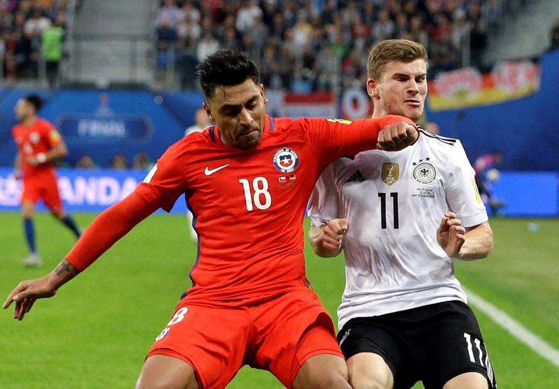 Then Germany launched a counterattack from inside its own penalty area that ended with the only goal, despite Marcelo Diaz’s attempts. The Chile midfielder turned and tried to clear the ball on the edge of his penalty area but didn’t spot Werner lurking. Goalkeeper Claudio Bravo was drawn off his line and Werner squared to Stindl, who had the simplest of tap-ins.