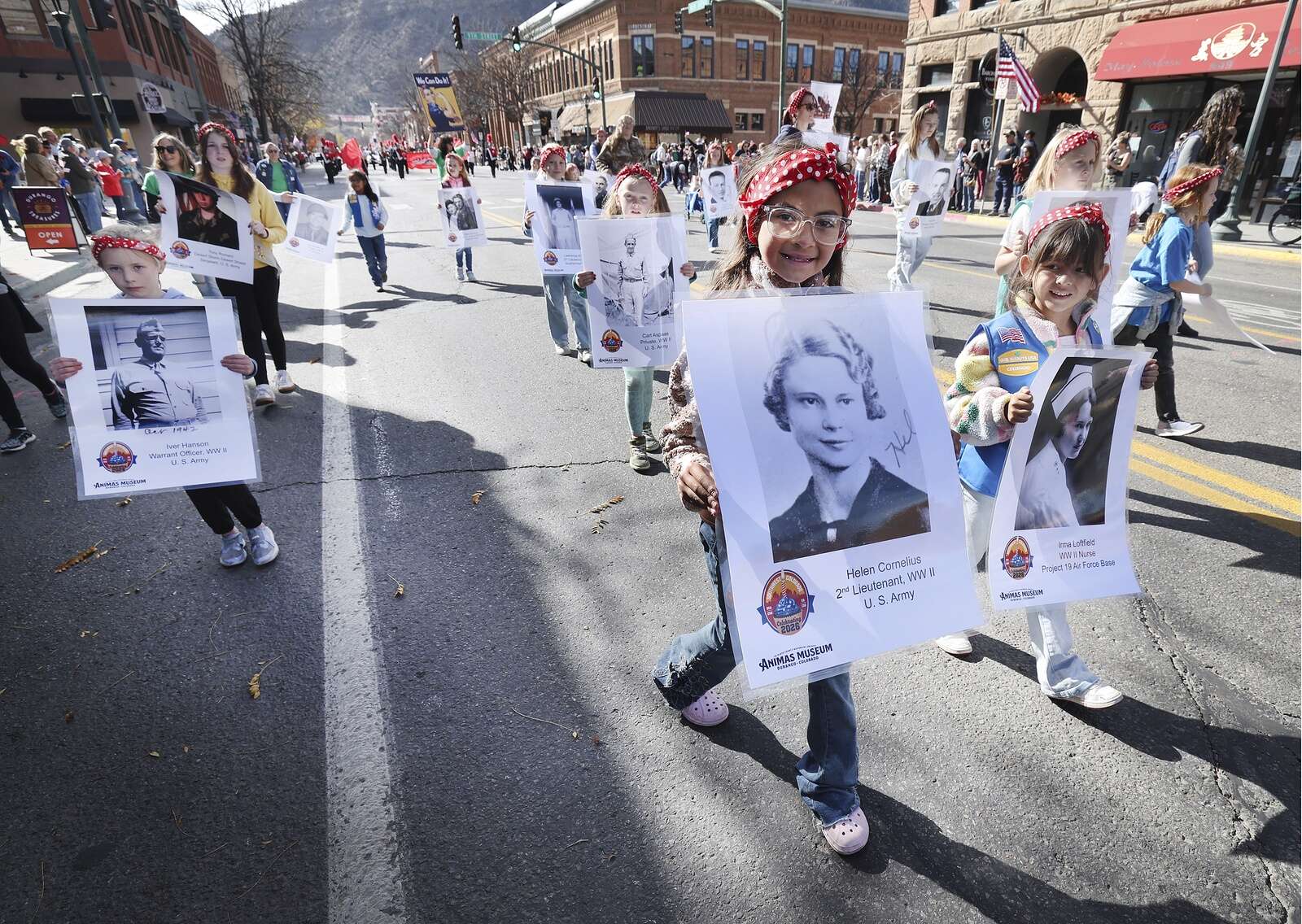 Local Girl Scouts of America carry pictures of veterans that they have studied while walking in the Veterans Day Parade on Main Avenue on Tuesday in downtown Durango. (Jerry McBride/Durango Herald)