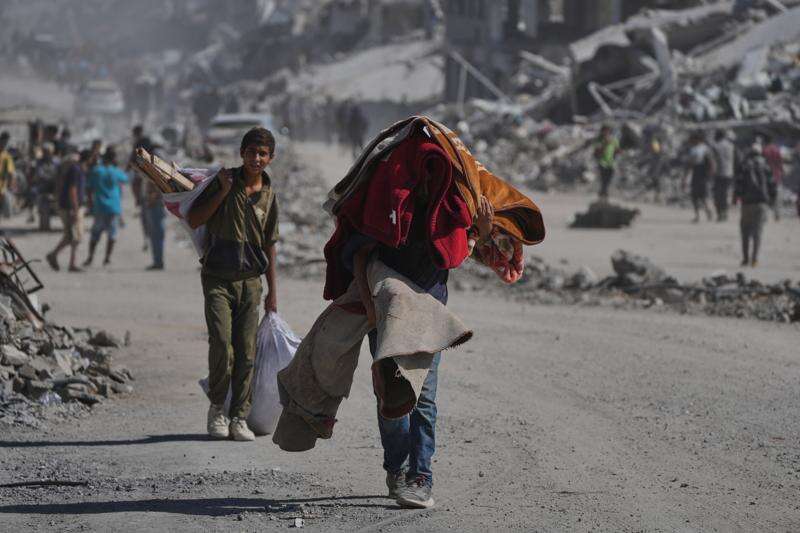 Displaced Palestinians carry their belongings as they walk along the heavily damaged Al-Jalaa Street in Gaza City, Saturday, Oct. 11, 2025, after Israel and Hamas agreed to a pause in their war and the release of the remaining hostages. (AP Photo/Abdel Kareem Hana)