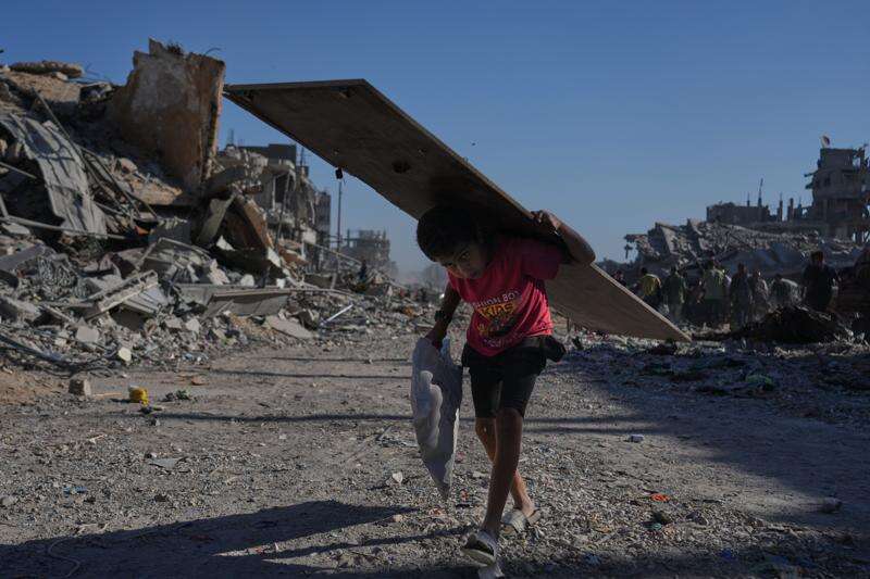 A displaced Palestinian boy carries a wooden board as he walks along the heavily damaged Al-Jalaa Street in Gaza City, Saturday, Oct. 11, 2025, after Israel and Hamas agreed to pause their war and release the remaining hostages. (AP Photo/Abdel Kareem Hana)