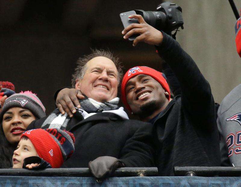 Along the route, Patriots players held up some of the team’s five Lombardi trophies.