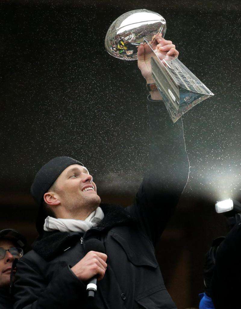 The crowd showered the MVP of Super Bowl 51 with chants of “MVP” and “We Want Six” as the snow, which fell in thick wet clumps most of the morning, broke just long enough for Brady and others to speak onstage.