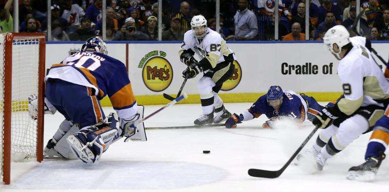 The Penguins seemed in control late, but New York drew even on goals by Kyle Okposo and John Tavares.