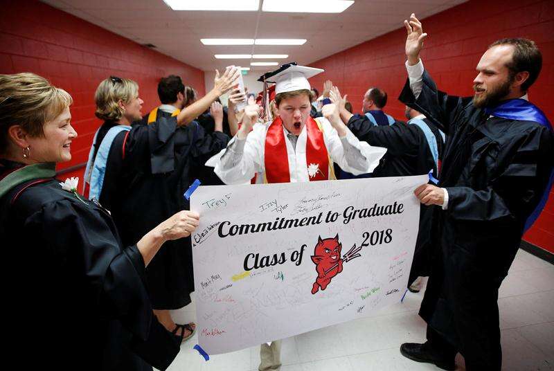 Joe Lawton, 18, a Durango High School graduating senior, dashes through a line of cheering teachers and staff members before commencement Friday evening at the school. About 250 students graduated.