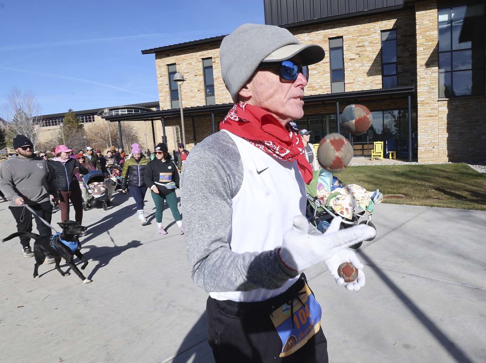Keith Baker juggles while running in the Durango Turkey Trot 5-mile race on Thursday at Fort Lewis College. (Jerry McBride/Durango Herald)