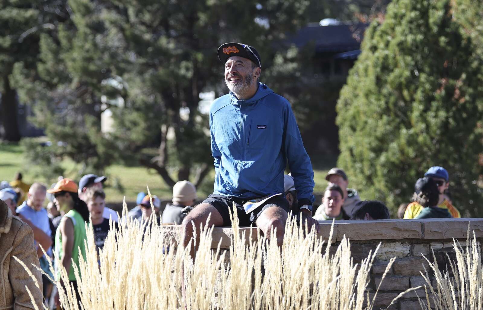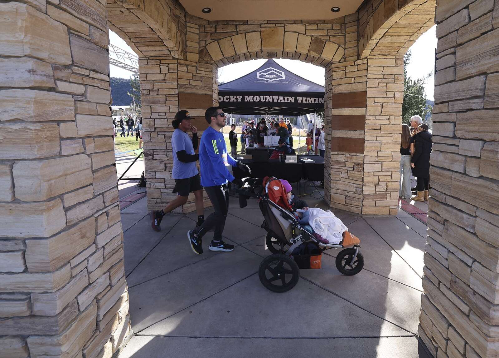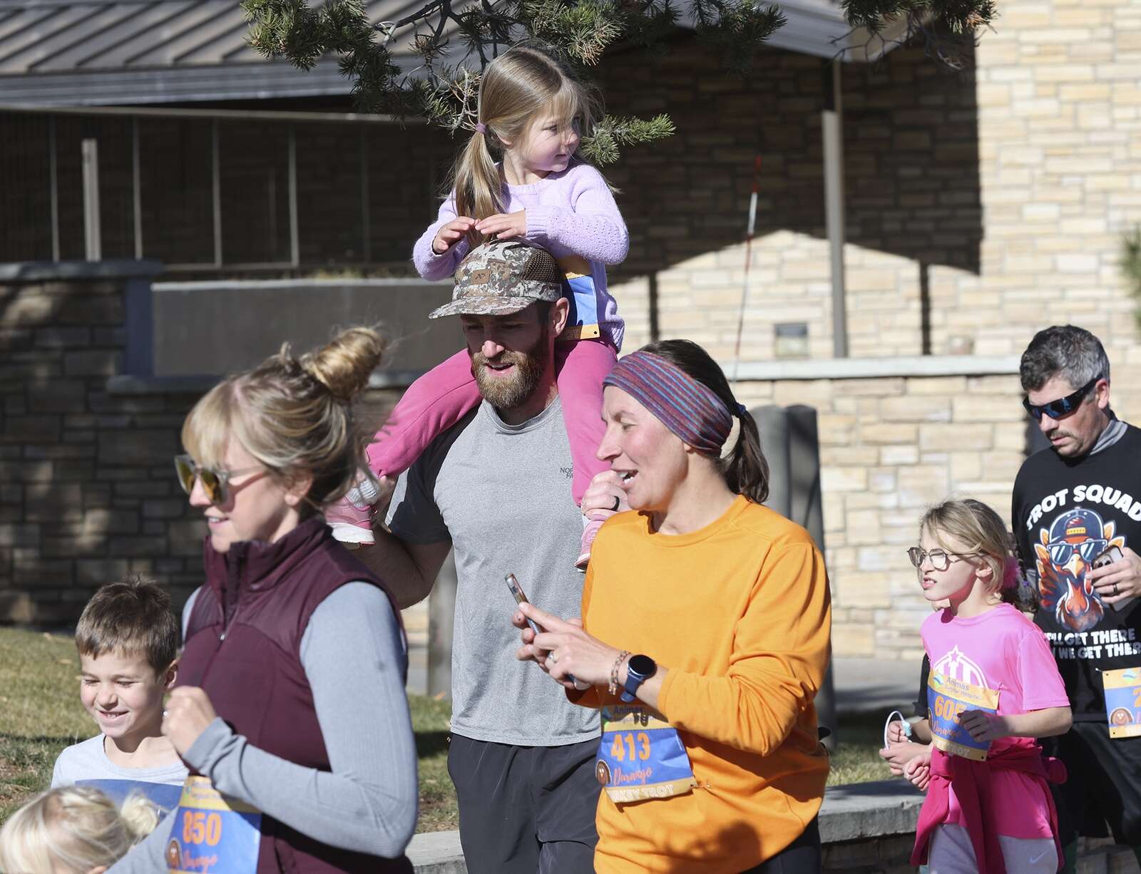 Bret Wilson congratulates fellow runners after fishing the Durango Turkey Trot 5-mile race on Thursday at Fort Lewis College. (Jerry McBride/Durango Herald)
