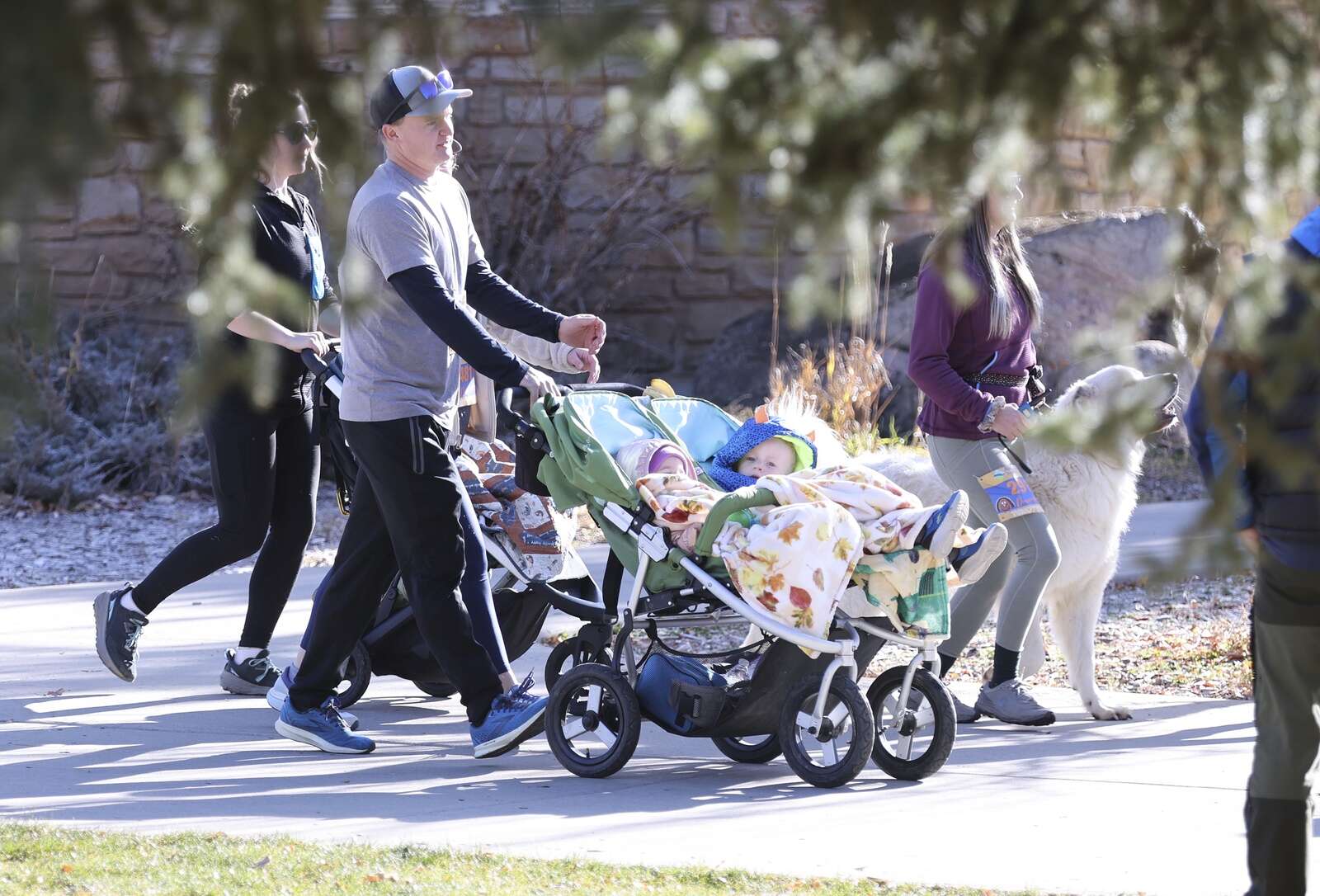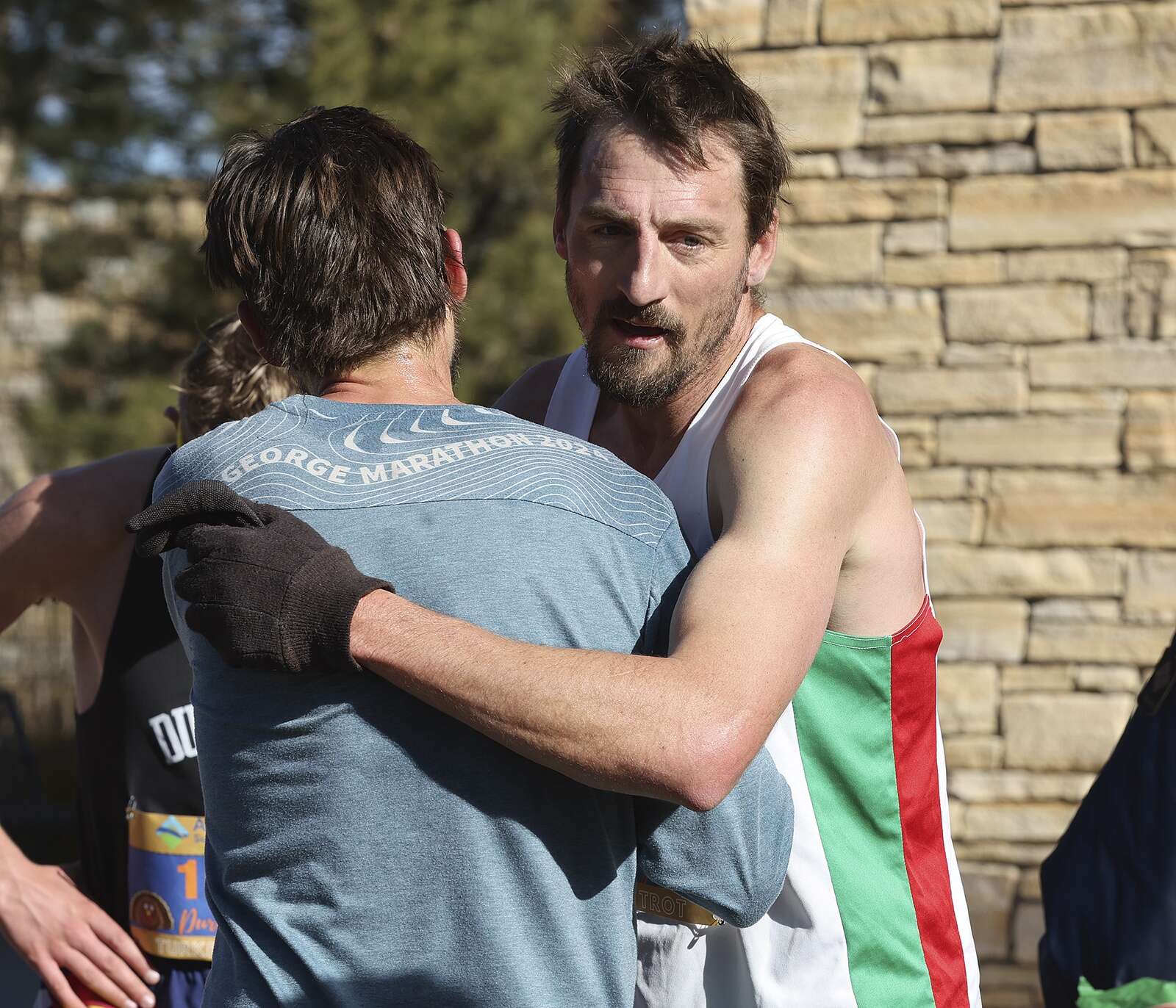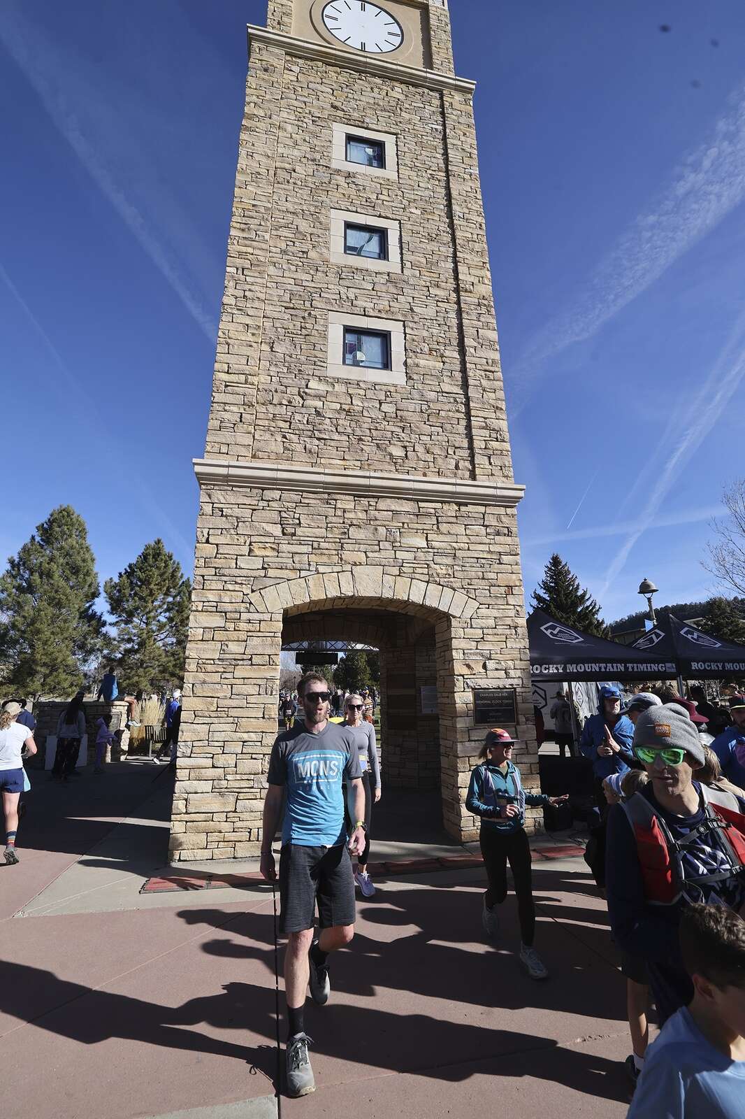 Bret Wilson congratulates fellow runners after fishing the Durango Turkey Trot 5-mile race on Thursday at Fort Lewis College. (Jerry McBride/Durango Herald)