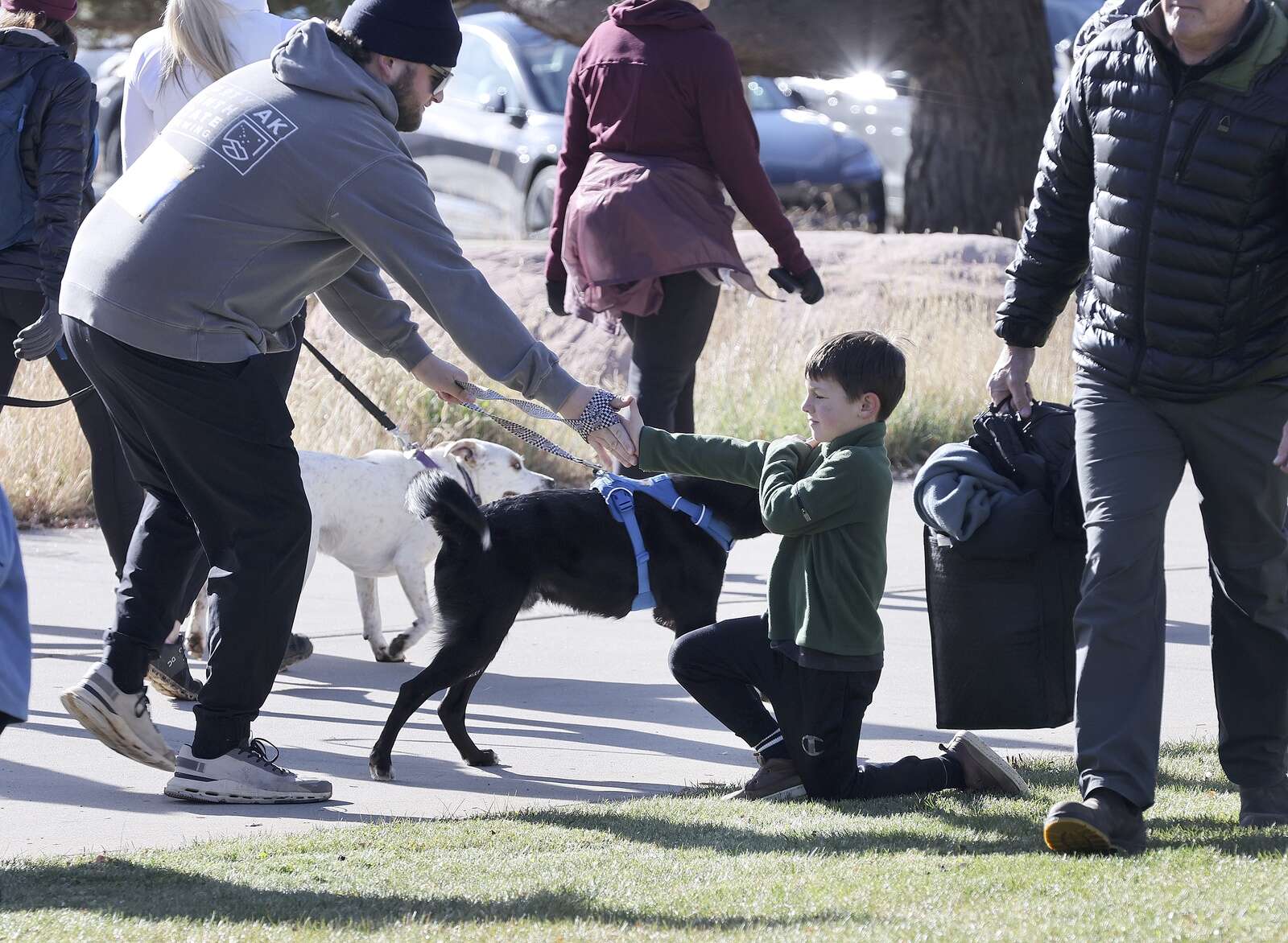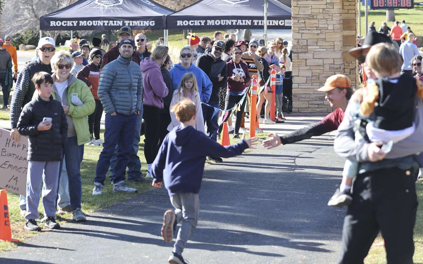 Milo Kolegas, 6, high-fives runners as they compete in the Durango Turkey Trot 5-mile race on Thursday at Fort Lewis College. (Jerry McBride/Durango Herald)