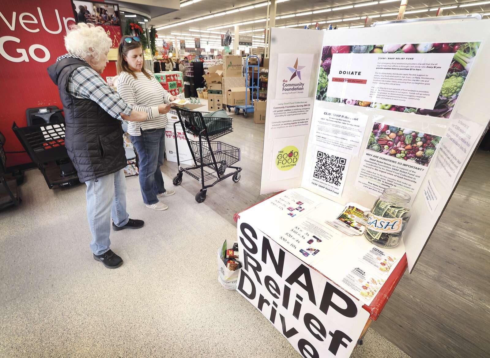 Kathleen Shadell, a volunteer, hands a brochure to Janelle Maynes about how to make a donation to a SNAP emergency relief fund on Saturday at Albertsons grocery store. The The temporary fund is hosted by The Good Food Collective and the Community Foundation Serving Southwest Colorado. Every $1 donated enables providers to purchase $7 worth of food thanks to bulk purchasing and nonprofit status. More than 12,000 Southwest Colorado residents have not received their November benefits as a result of the government shutdown. The relief drive will be back at the same location Nov. 15. (Jerry McBride/Durango Herald)