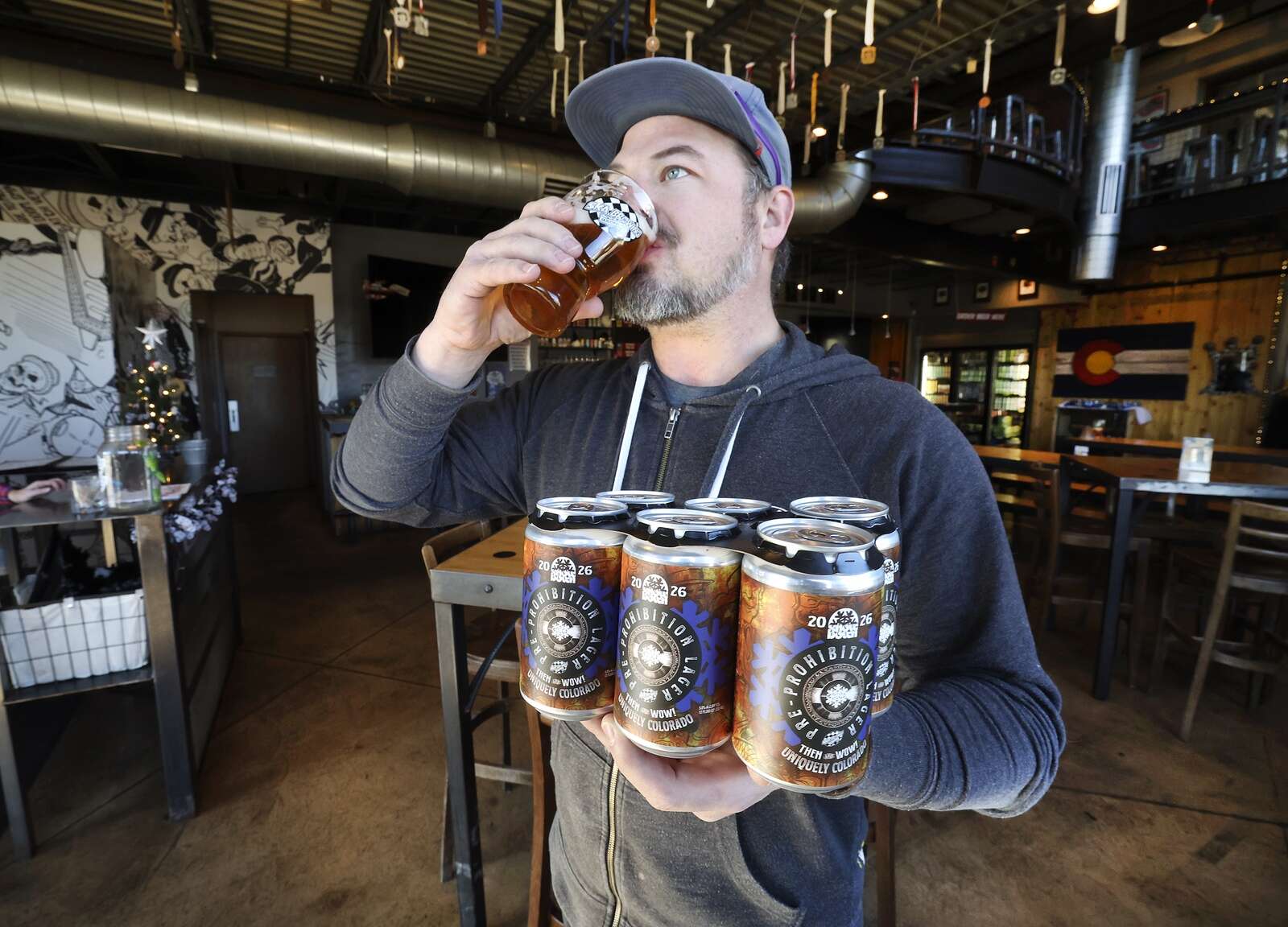Chris Kurr, production manager with Ska Brewing, takes a drink of the newly released 2026 Snowdown beer, Pre-Prohibition Lager, on Thursday at the brewery. The smooth and easy-drinking beer is made with corn and cluster hops, one of the oldest types of hops in the U.S. Durango artist Shan Wells designed the label and also the 2026 Snowdown poster with the theme “Uniquely Colorado – Then and Wow.” (Jerry McBride/Durango Herald)