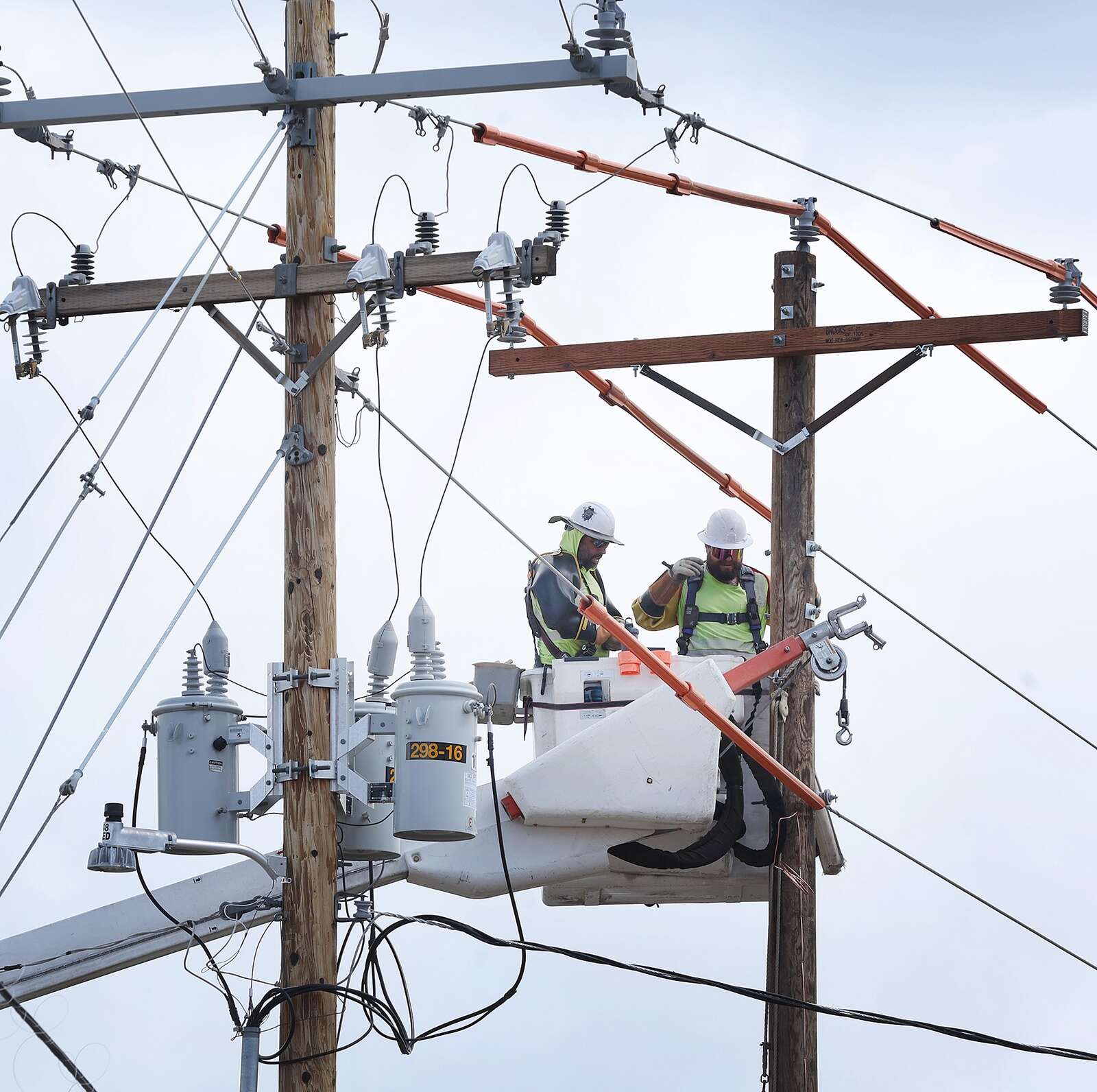 Westly Moore, left, and Trevor Mortensen, both with La Plata Electric Association, work to replace the power pole near Metz Lane and East Animas Road (County Road 250) on Thursday in north Durango. (Jerry McBride/Durango Herald)