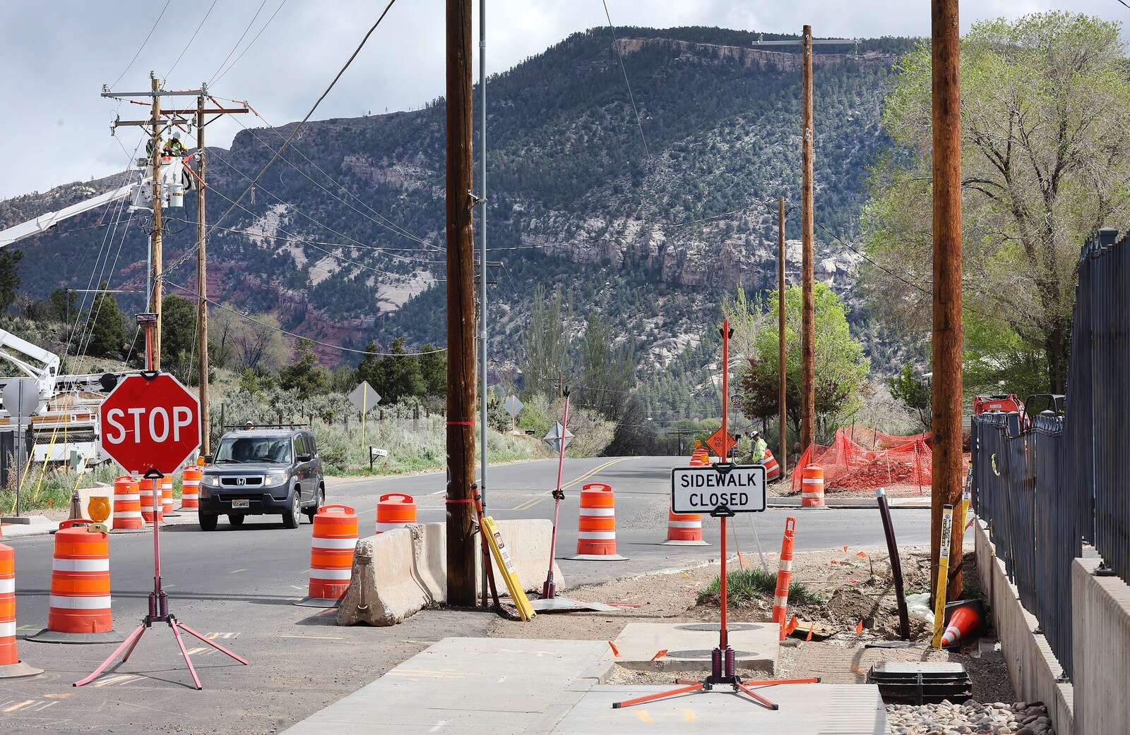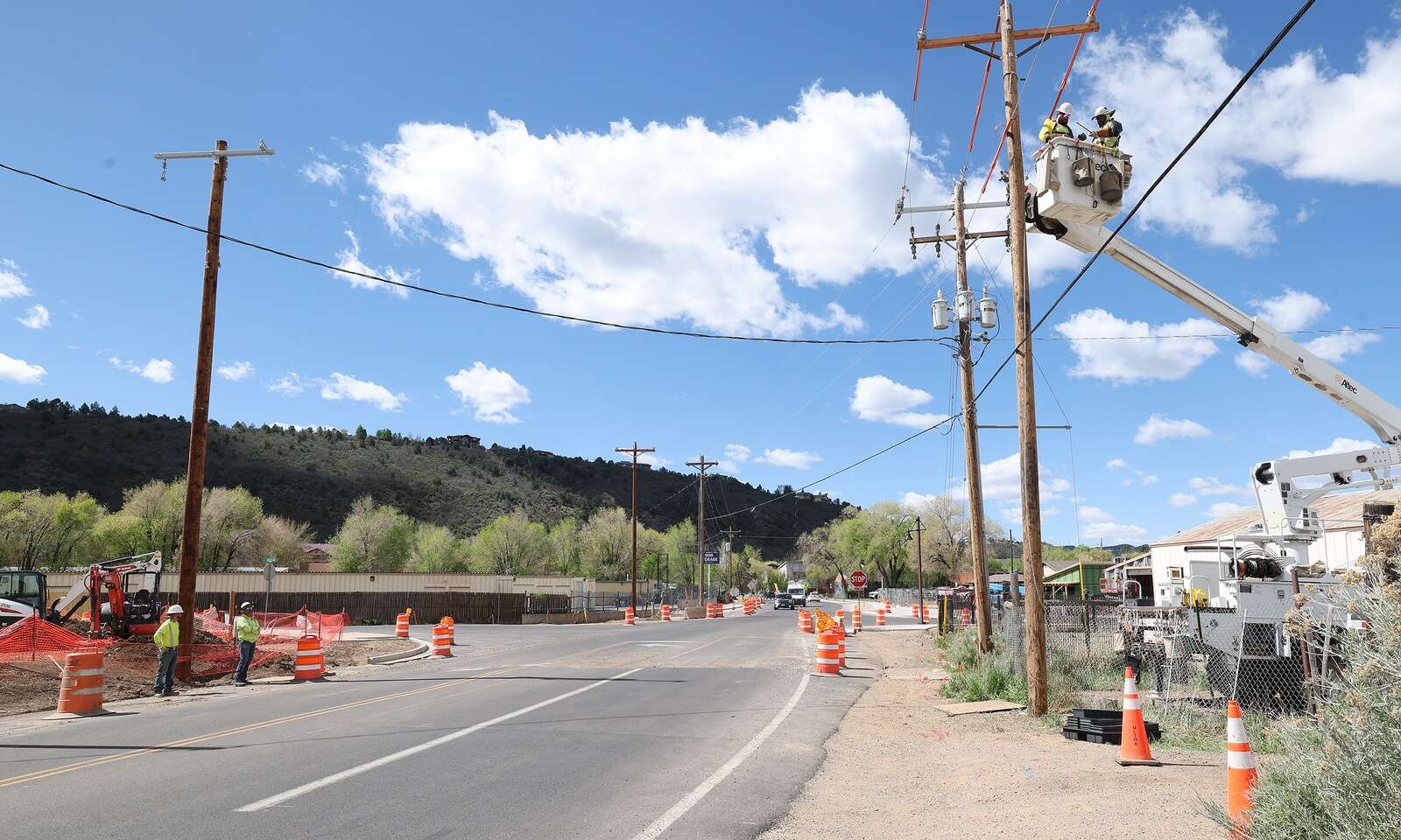 La Plata Electric Association replaces the power pole near Metz Lane and East Animas Road (County Road 250) on Thursday in north Durango. Workers have placed four new poles to replace the problem pole that remained after reconstruction of the road. Work should be completed by mid- to late-May. (Jerry McBride/Durango Herald)