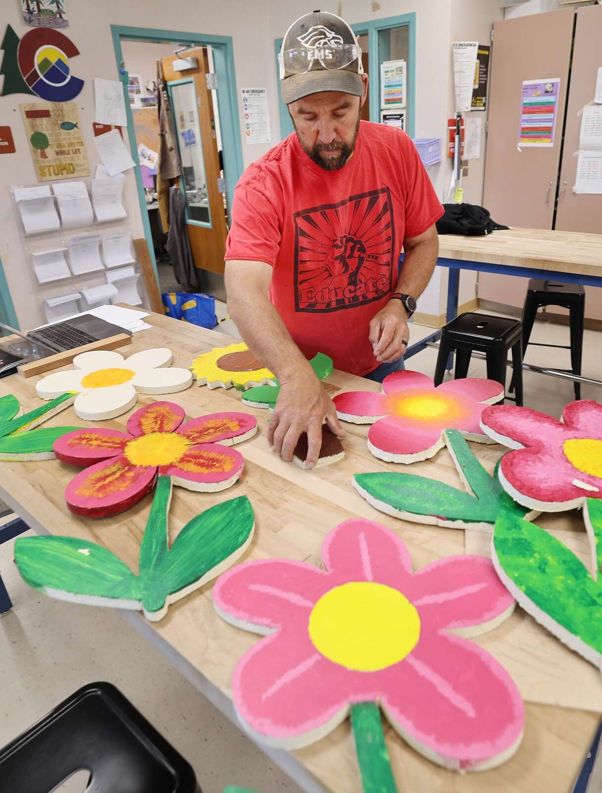 Escalante Middle School wood working teacher Bryan Bagdol shows the painted wood flowers his students made for the playhouses they are building. (Jerry McBride/Durango Herald)