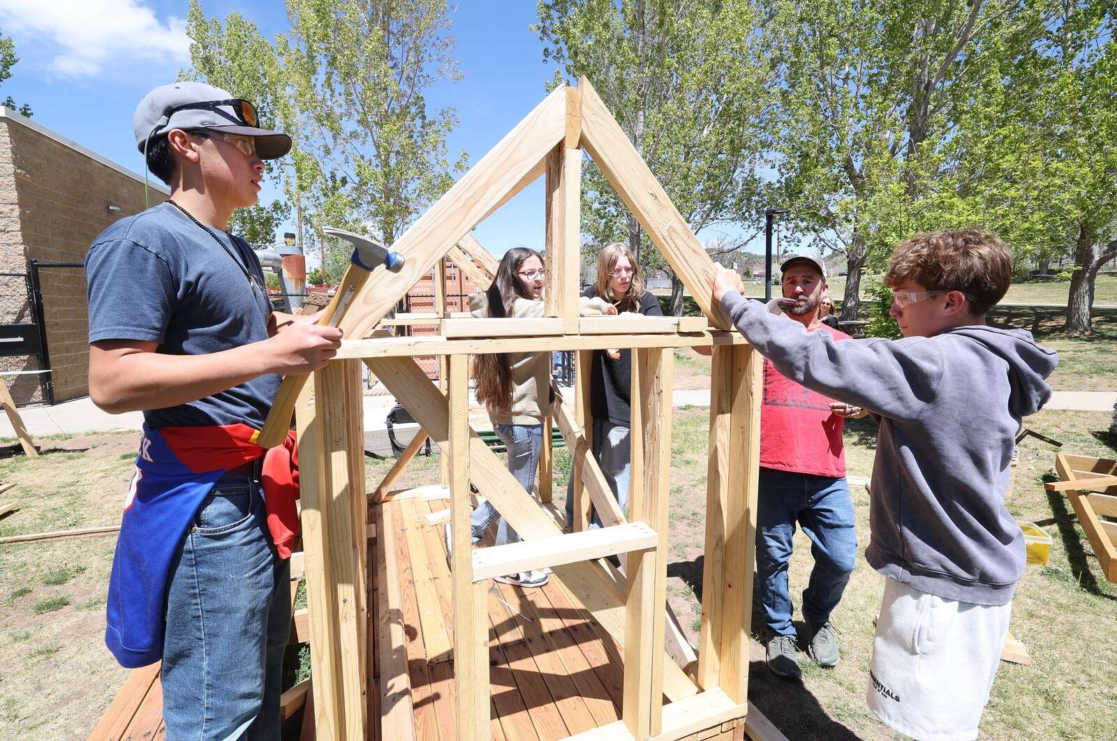 Escalante Middle School wood working teacher Bryan Bagdol works with eighth graders from left, Kolten Merrick, 14; Yanira Rodriguez, 13; Finely Pribble, 13; and Wesley Schaefer, 13, as they build a playhouse Tuesday at the school. (Jerry McBride/Durango Herald)