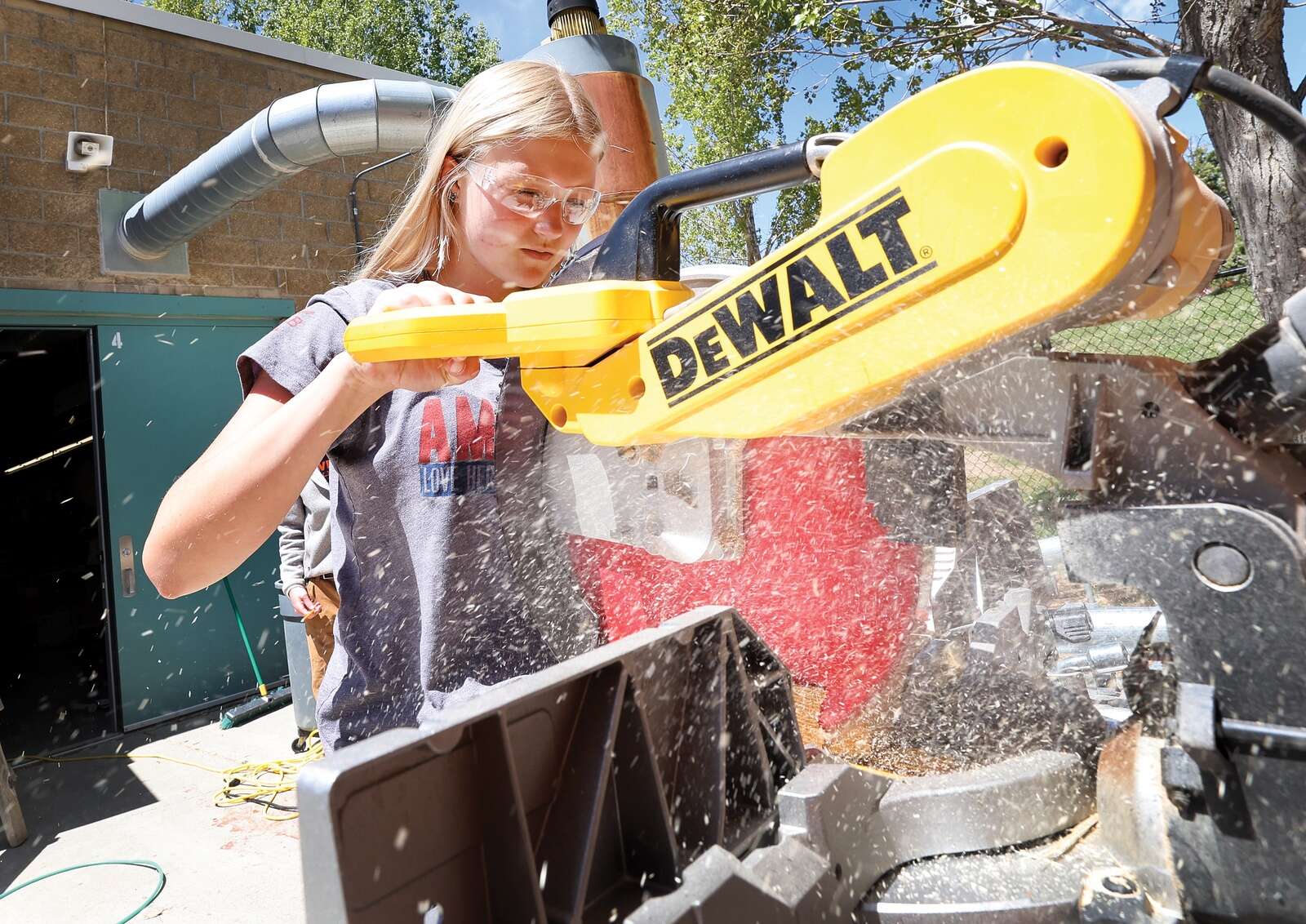 Escalante Middle School student, Abilene Walker, 13, uses a chop saw while building a playhouse Tuesday at the school. (Jerry McBride/Durango Herald)
