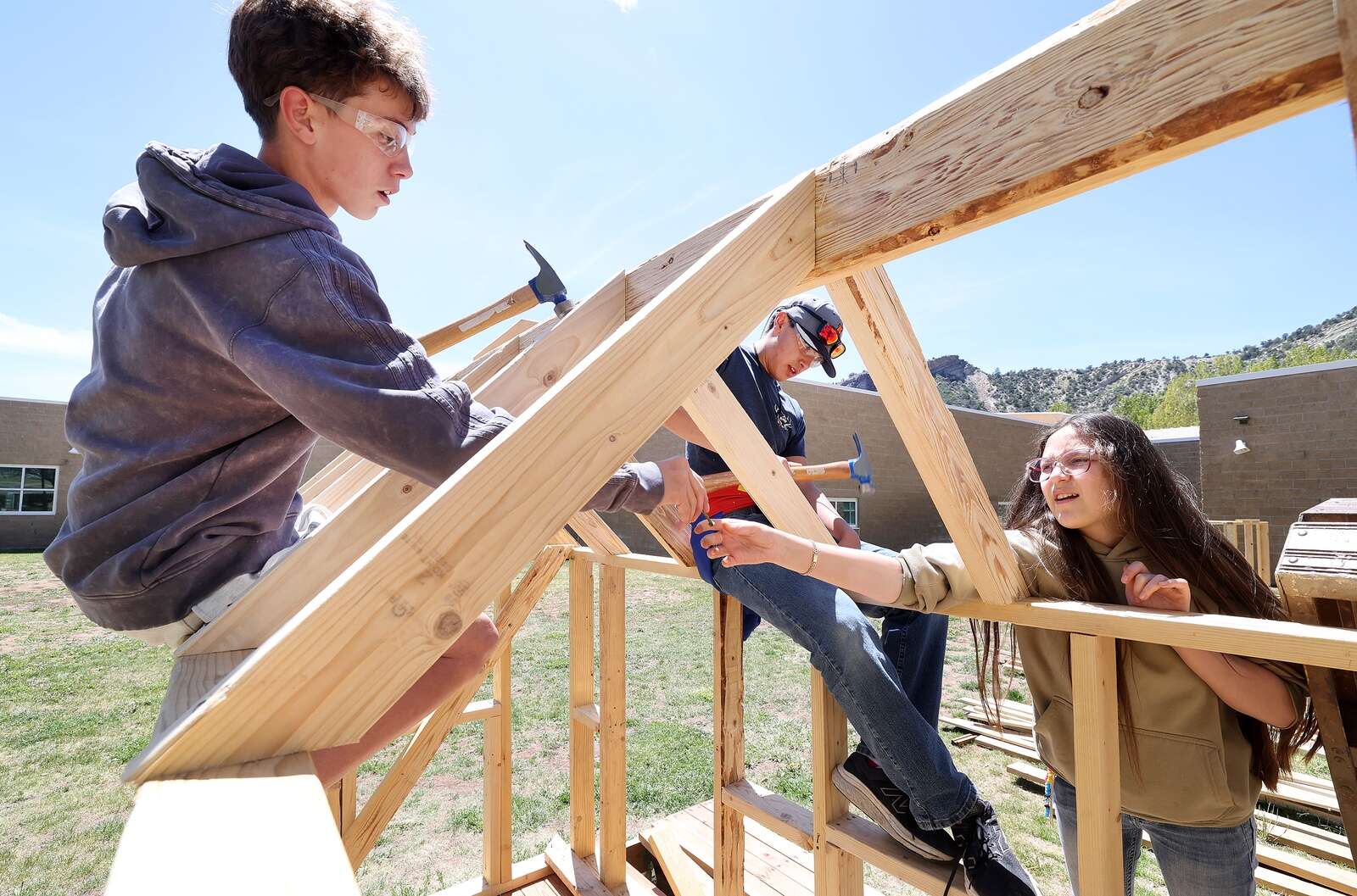 Escalante Middle School eighth graders from left, Wesley Schaefer, 13; Kolten Merrick, 14; and Yanira Rodriguez, 13, build a playhouse Tuesday at the school. Seventeen students in the level 1 construction trades class are building five playhouses with donated lumber that will be distributed to the four elementary schools that feed into Escalante Middle School. One playhouse will be sold to help recoup some of the cost of building them. (Jerry McBride/Durango Herald)