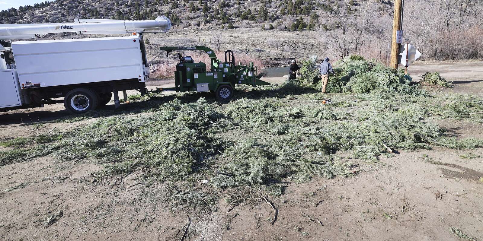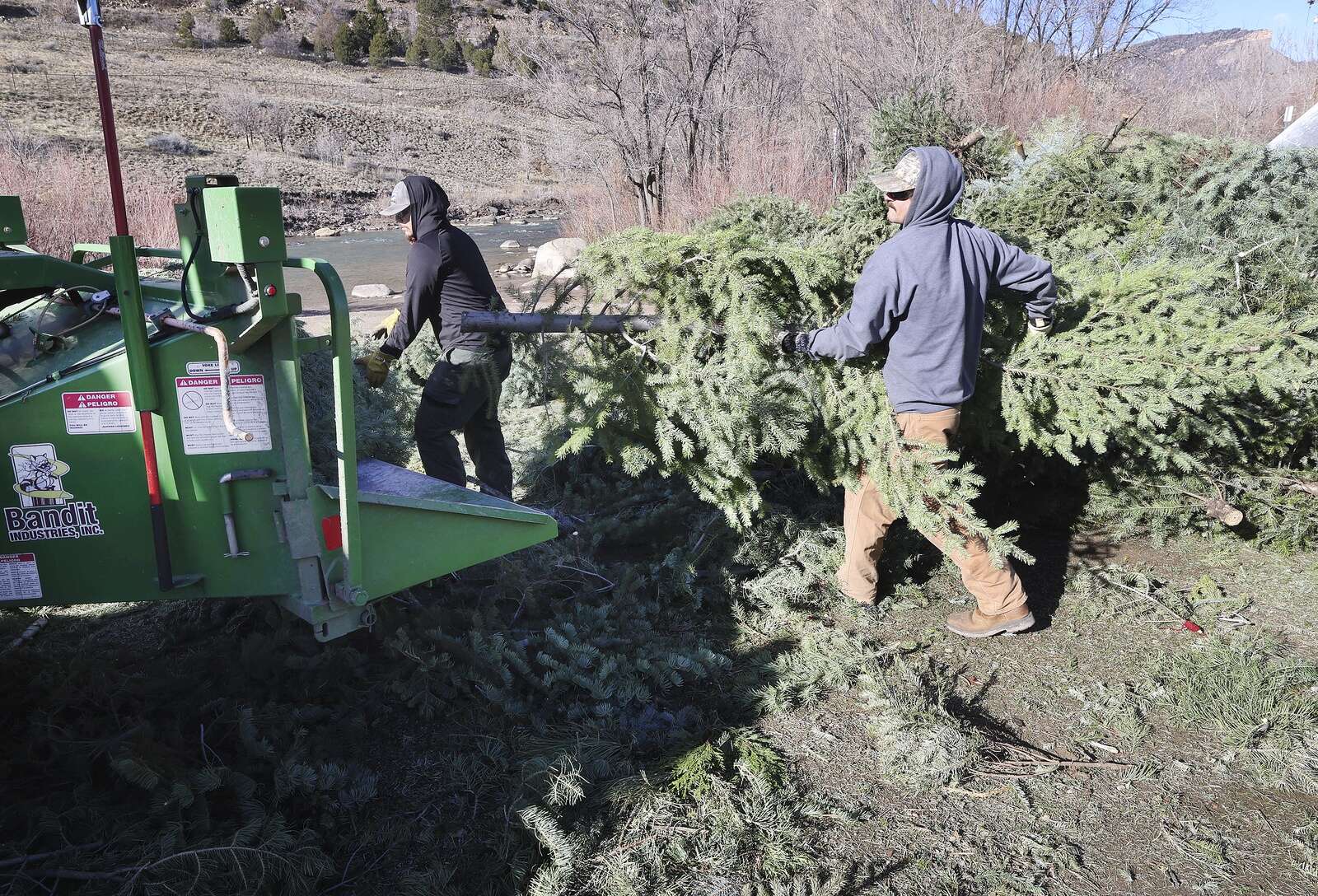 Brent Interpreter, left, and James Paratti, both with Durango Parks and Recreation forestry division, feed Christmas trees into the mulcher Tuesday at Santa Rita Park. So far this year they’ve ground up about 300 trees that have been dropped off in the park’s parking area behind the playground next to the Animas River. Trees can be dropped off until Jan. 31. Mulch from the trees, along with other types of tree mulch, is piled up on the east side of Greenmount Cemetery and is free to the public. (Jerry McBride/Durango Herald)