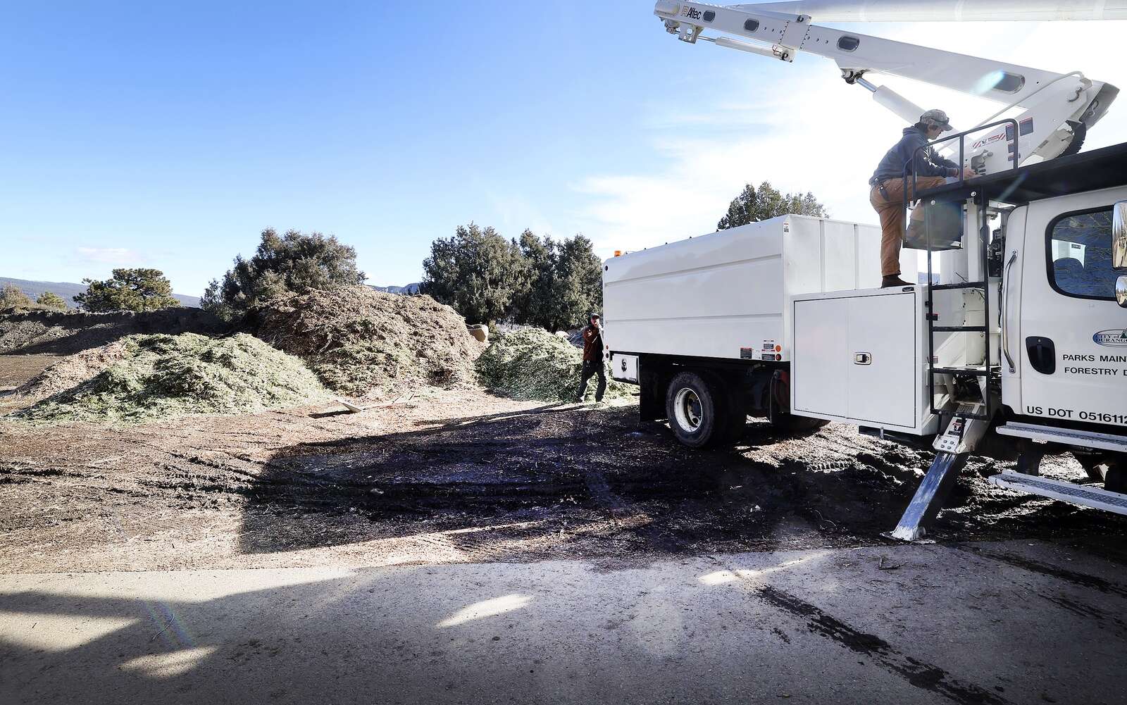 Brent Interpreter, left, and James Paratti, both with Durango Parks and Recreation forestry division, unload Christmas tree mulch next to other types of tree mulch Tuesday on the east side of Greenmount Cemetery. The mulch is free to the public. (Jerry McBride/Durango Herald)