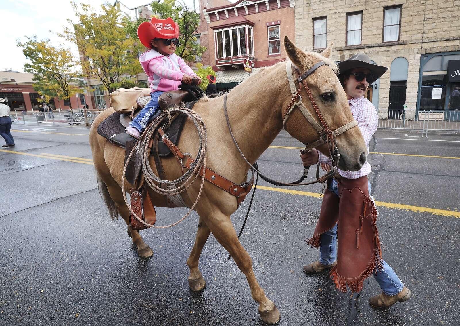 Smitty Smith gives Evelynn Silas a ride on his horse Dolly on Saturday during the Durango Cowboy Gathering Horseback Social on Main Avenue in downtown Durango. (Jerry McBride/Durango Herald)