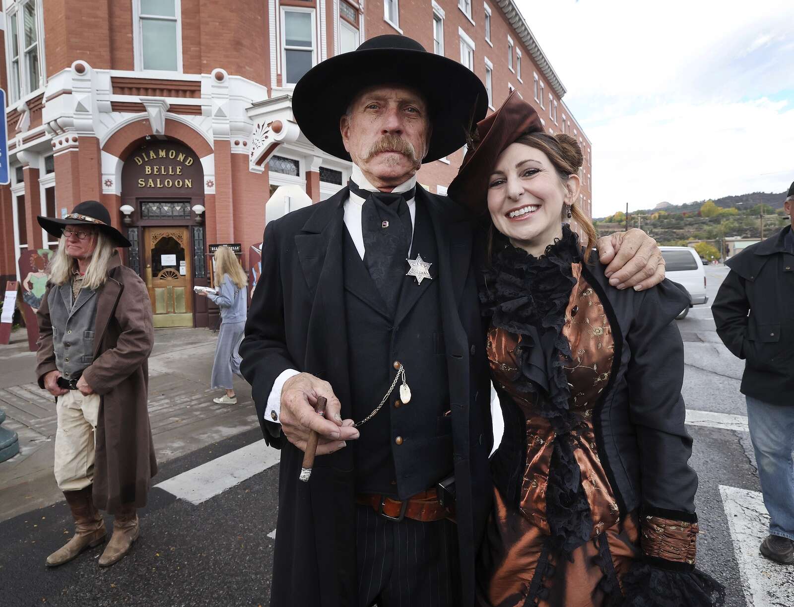 Tom Draft is dressed as Wyatt Earp, and Jessica Sugar Wolf is dressed in 1820s-style clothing on Saturday during the Durango Cowboy Gathering Horseback Social on Main Avenue in downtown Durango. (Jerry McBride/Durango Herald)