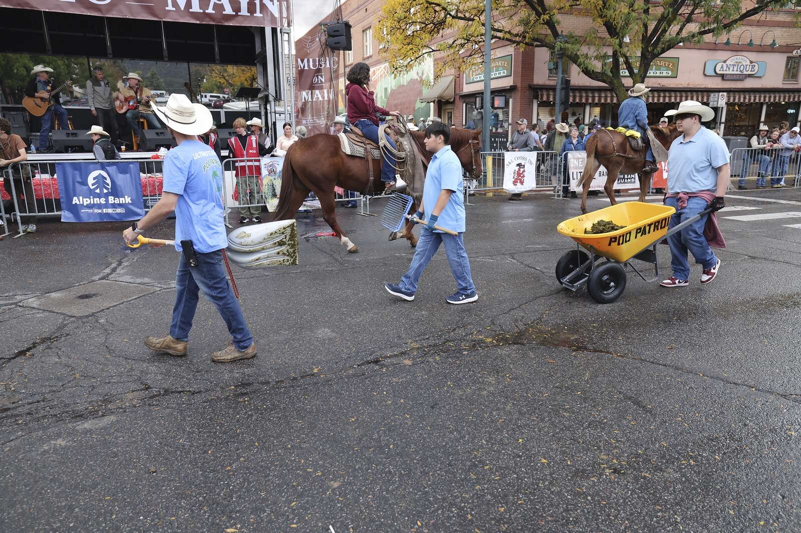 Teams of three get to pick up what the horses leave behind during the Durango Cowboy Gathering Parade on Saturday on Main Avenue in downtown Durango. (Jerry McBride/Durango Herald)