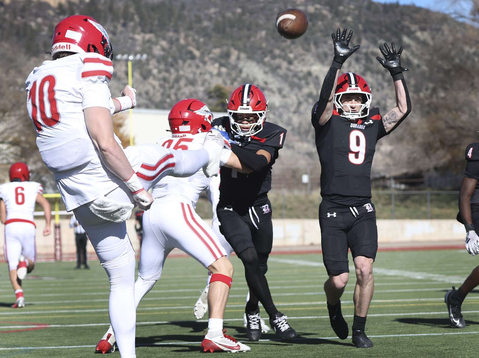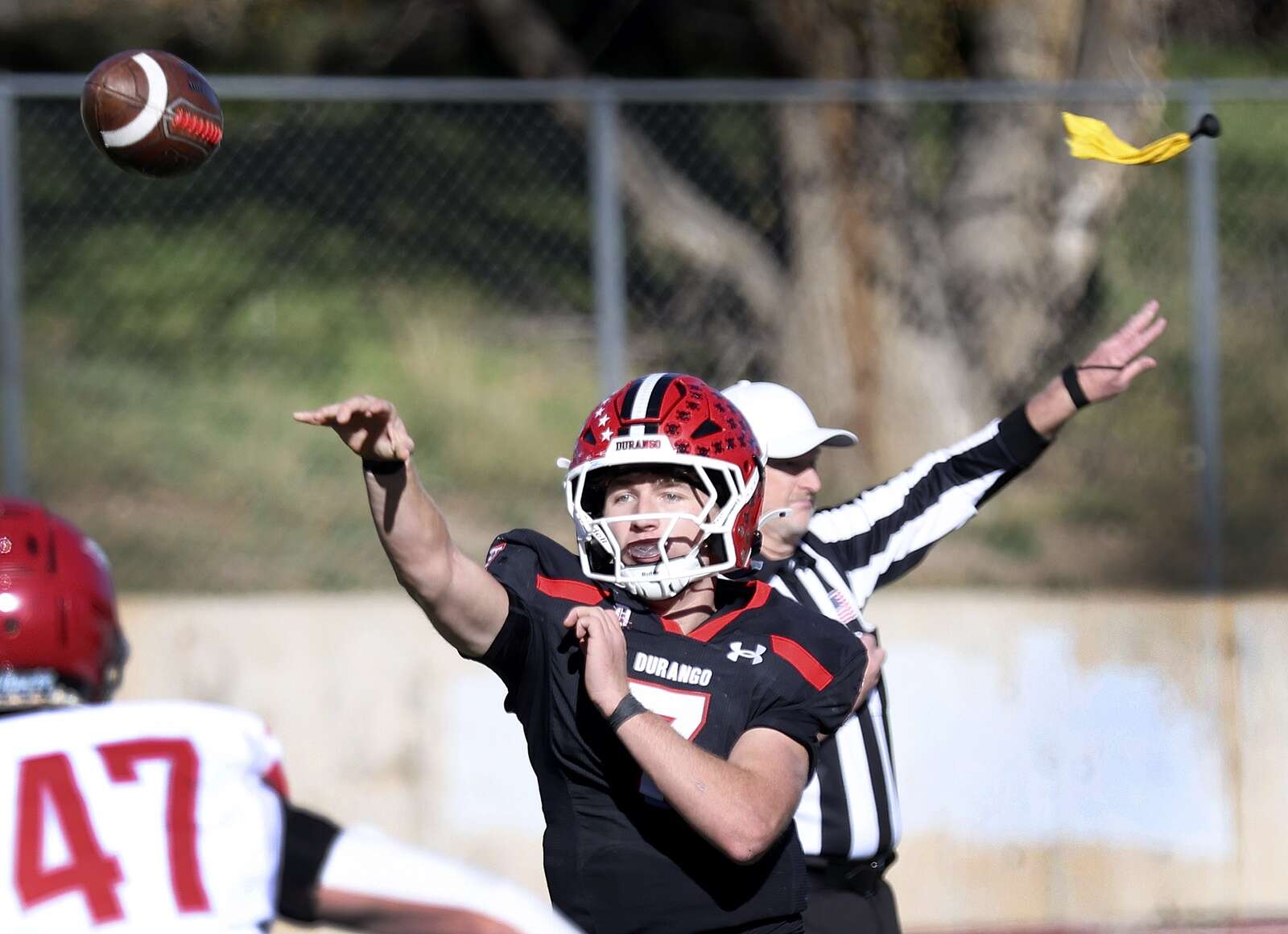 Quarterback Grady Feeney of Durango High School passes the ball while playing Heritage High School in the state quarterfinals playoff game on Saturday at DHS. (Jerry McBride/Durango Herald)