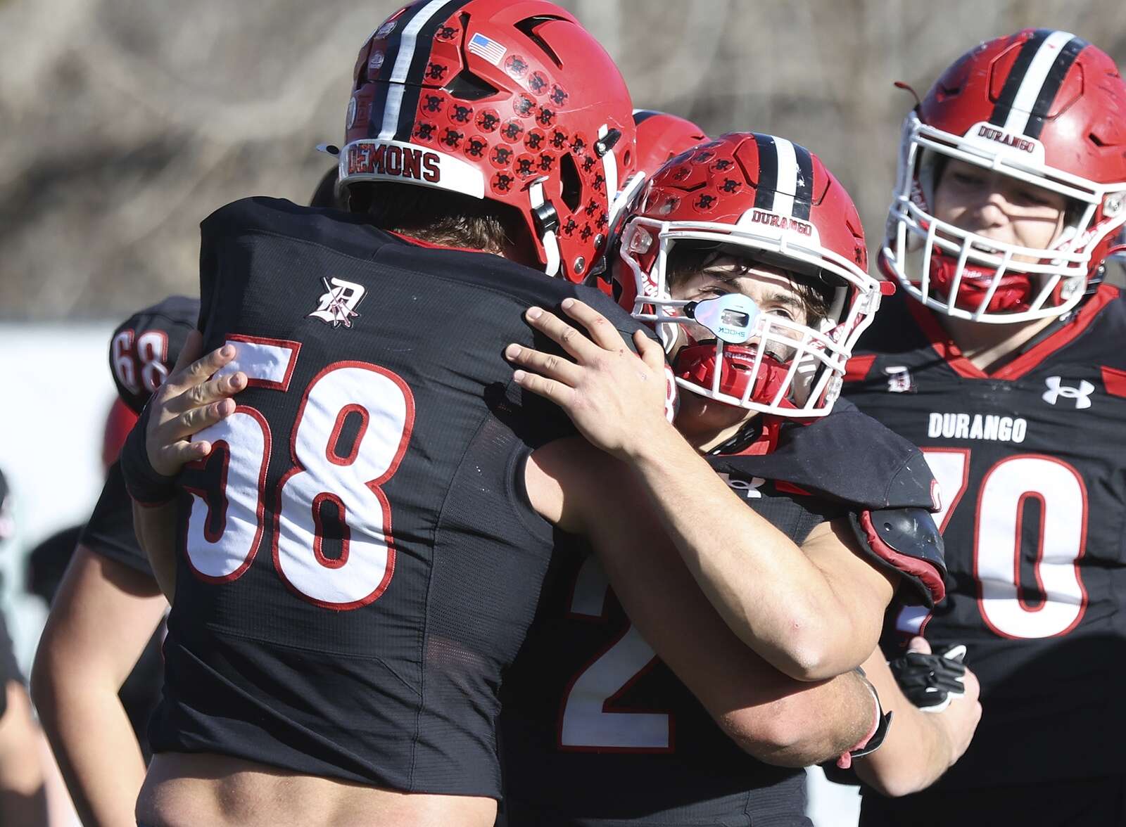 Durango High School football players hug each other after the loss of the state quarterfinals playoff game against Heritage High School on Saturday.