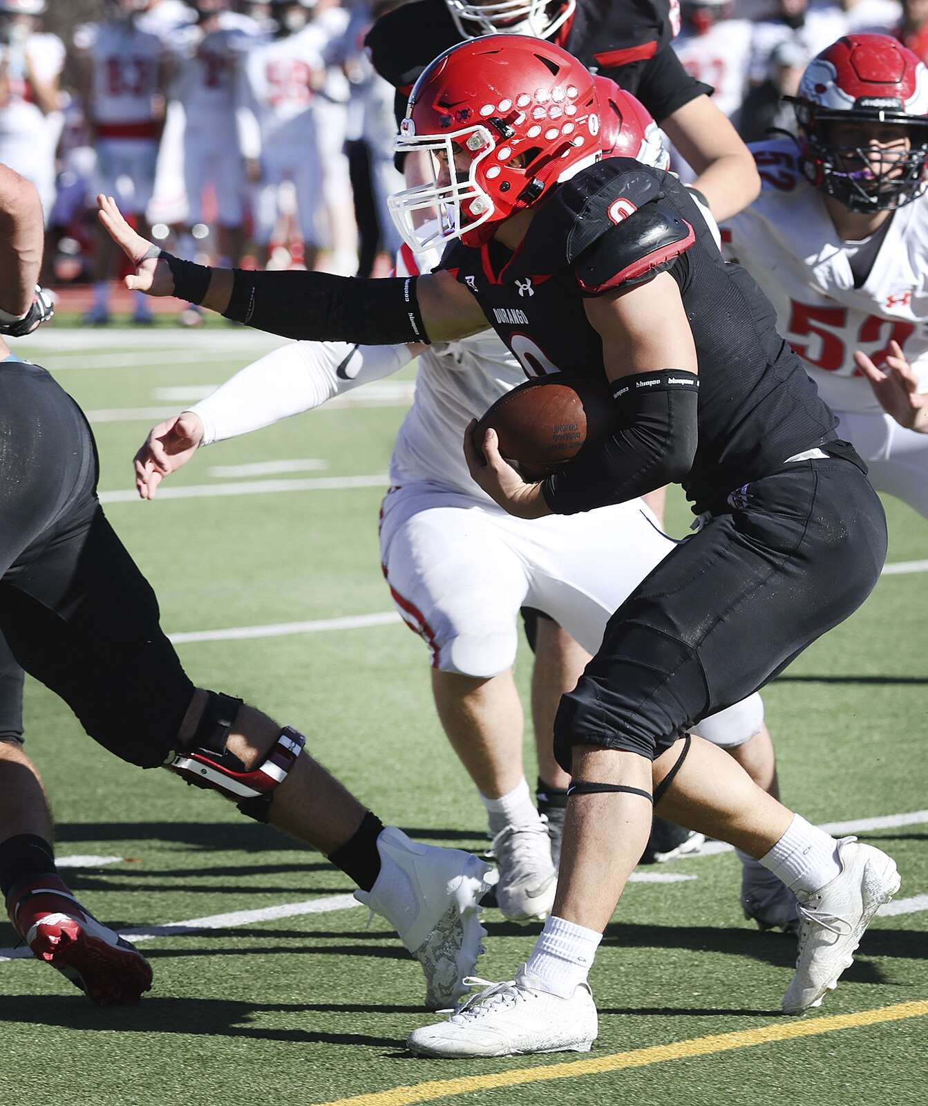 Mason Miller of Durango High School runs the ball against Heritage High School during the state quarterfinals playoff game on Saturday at DHS. (Jerry McBride/Durango Herald)