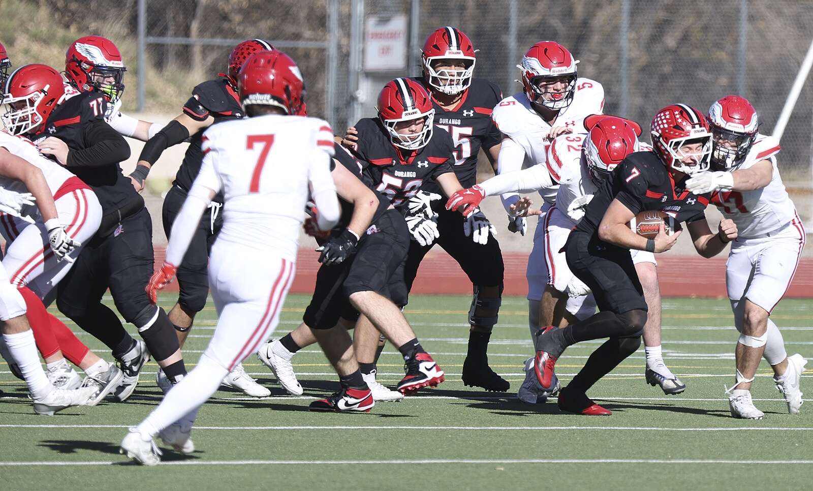 Quarterback Grady Feeney of Durango High School fights through a tackle while playing Heritage High School in the state quarterfinals playoff game on Saturday at DHS. (Jerry McBride/Durango Herald)
