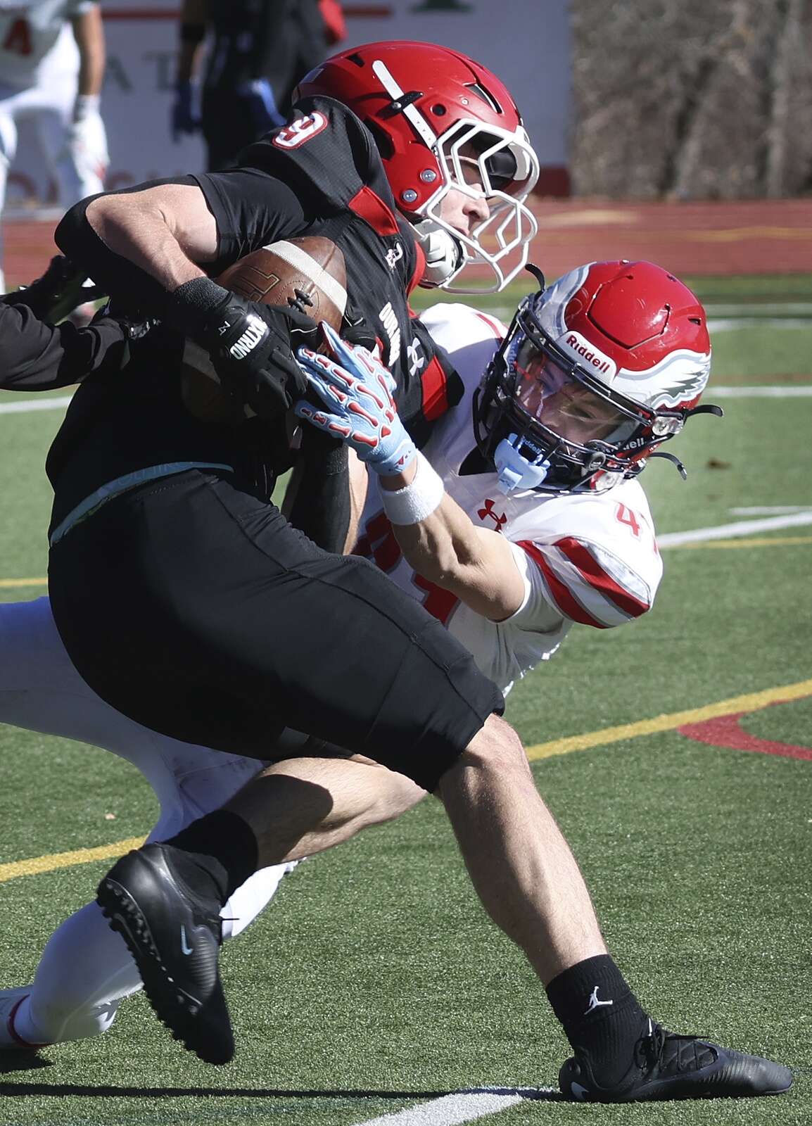 Presley English of Durango High School intercepts a Heritage High School pass during the state quarterfinals playoff game on Saturday at DHS. (Jerry McBride/Durango Herald)