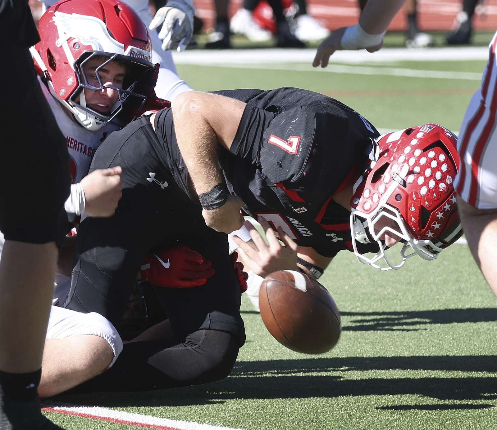 Quarterback Grady Feeney of Durango High School fumbles while playing Heritage High School in the state quarterfinals playoff game on Saturday at DHS. (Jerry McBride/Durango Herald)