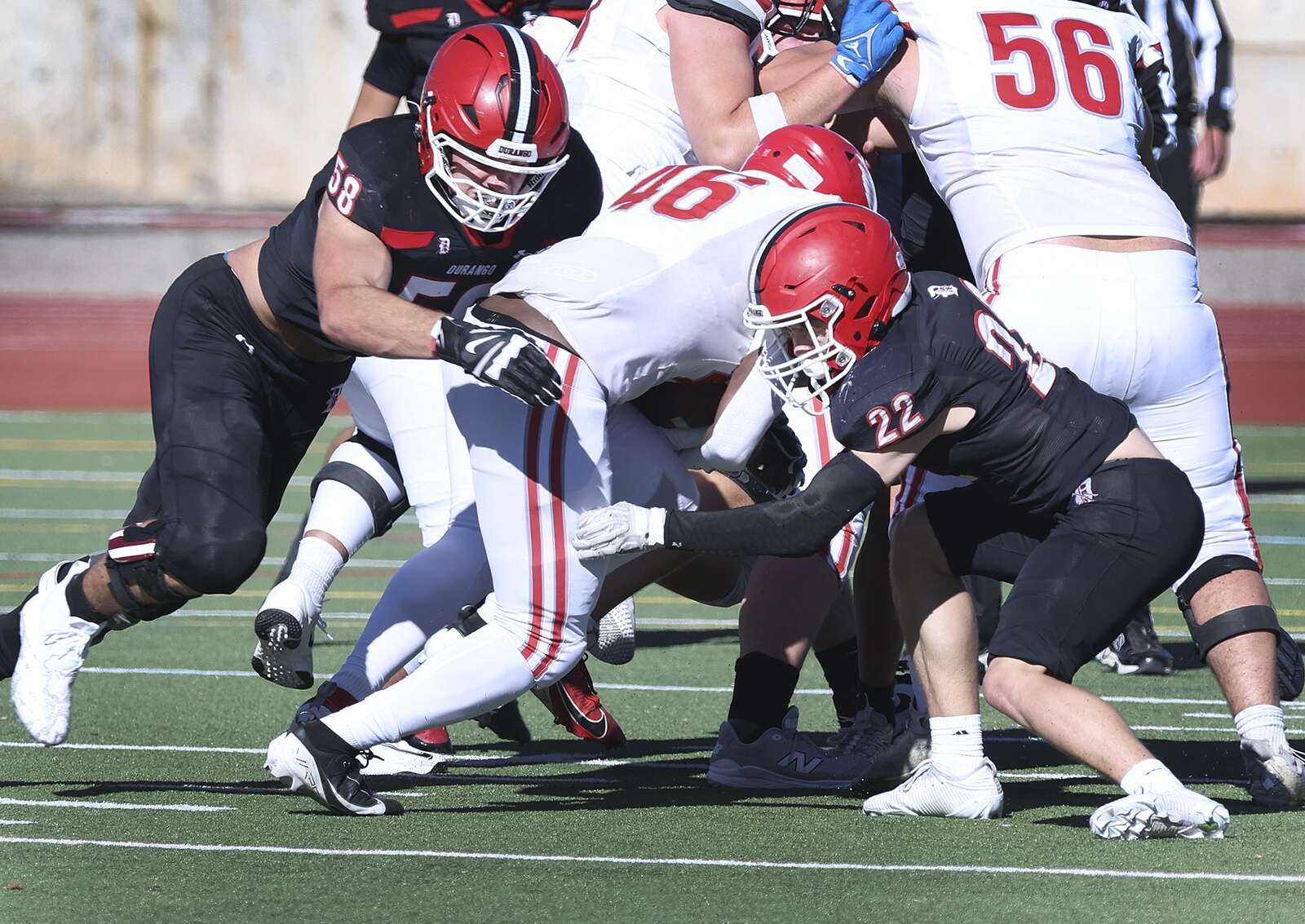 Owen Cheatham, left, and Hayes Fancher of Durango High School tackle a Heritage High School running back during the state quarterfinals playoff game on Saturday at DHS. (Jerry McBride/Durango Herald)