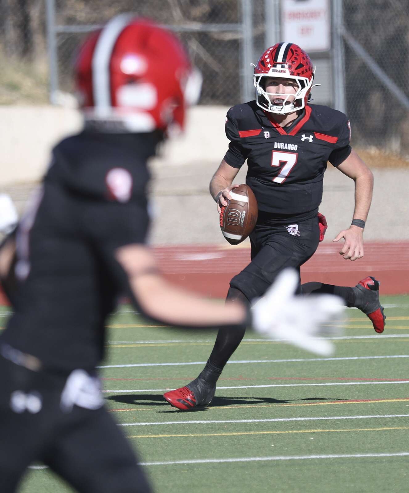 Quarterback Grady Feeney of Durango High School looks for his receiver while playing Heritage High School in the state quarterfinals playoff game on Saturday at DHS. (Jerry McBride/Durango Herald)