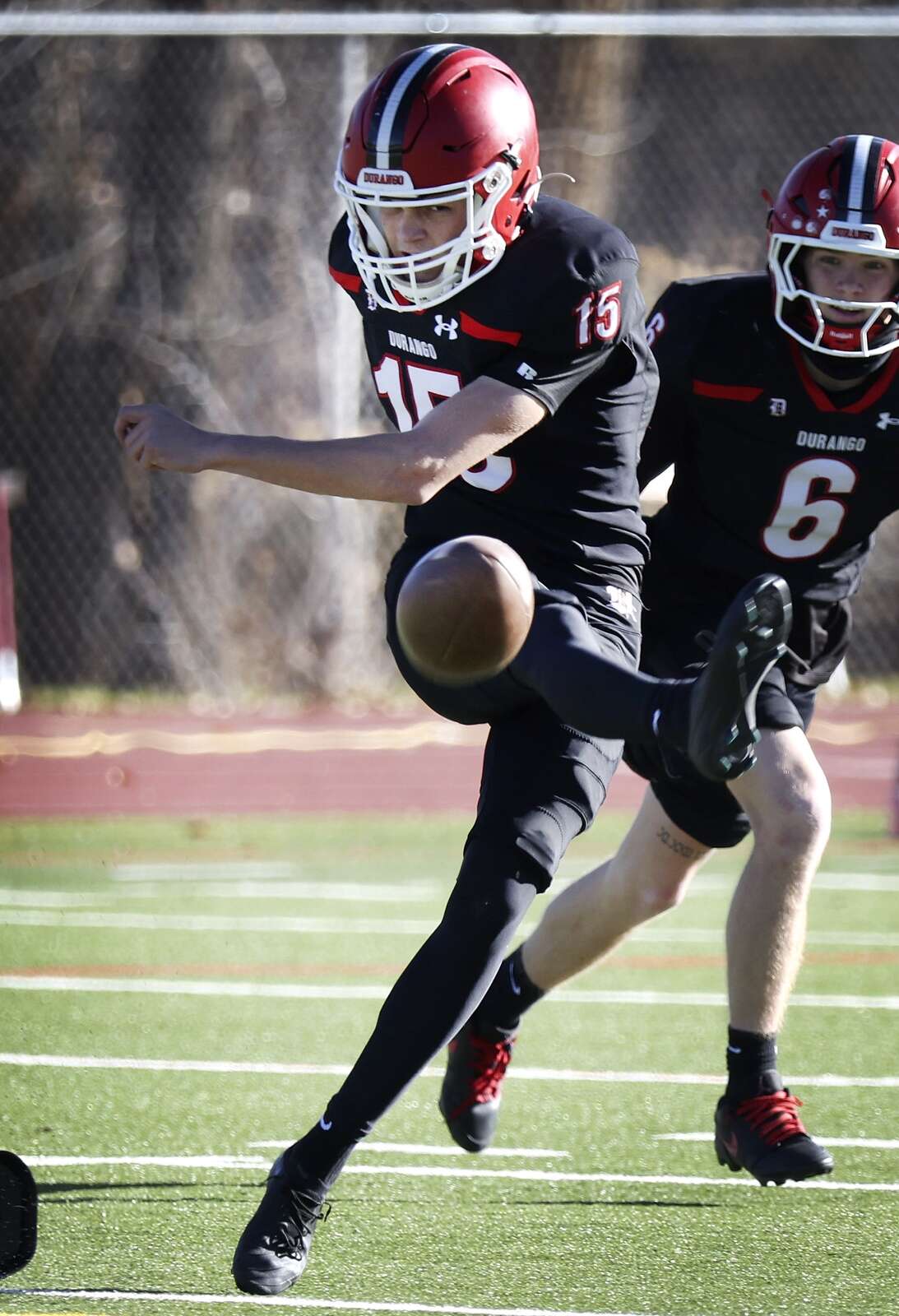 Dylan Burns of Durango High School kicks off while playing Heritage High School during the state quarterfinals playoff game on Saturday at DHS. (Jerry McBride/Durango Herald)