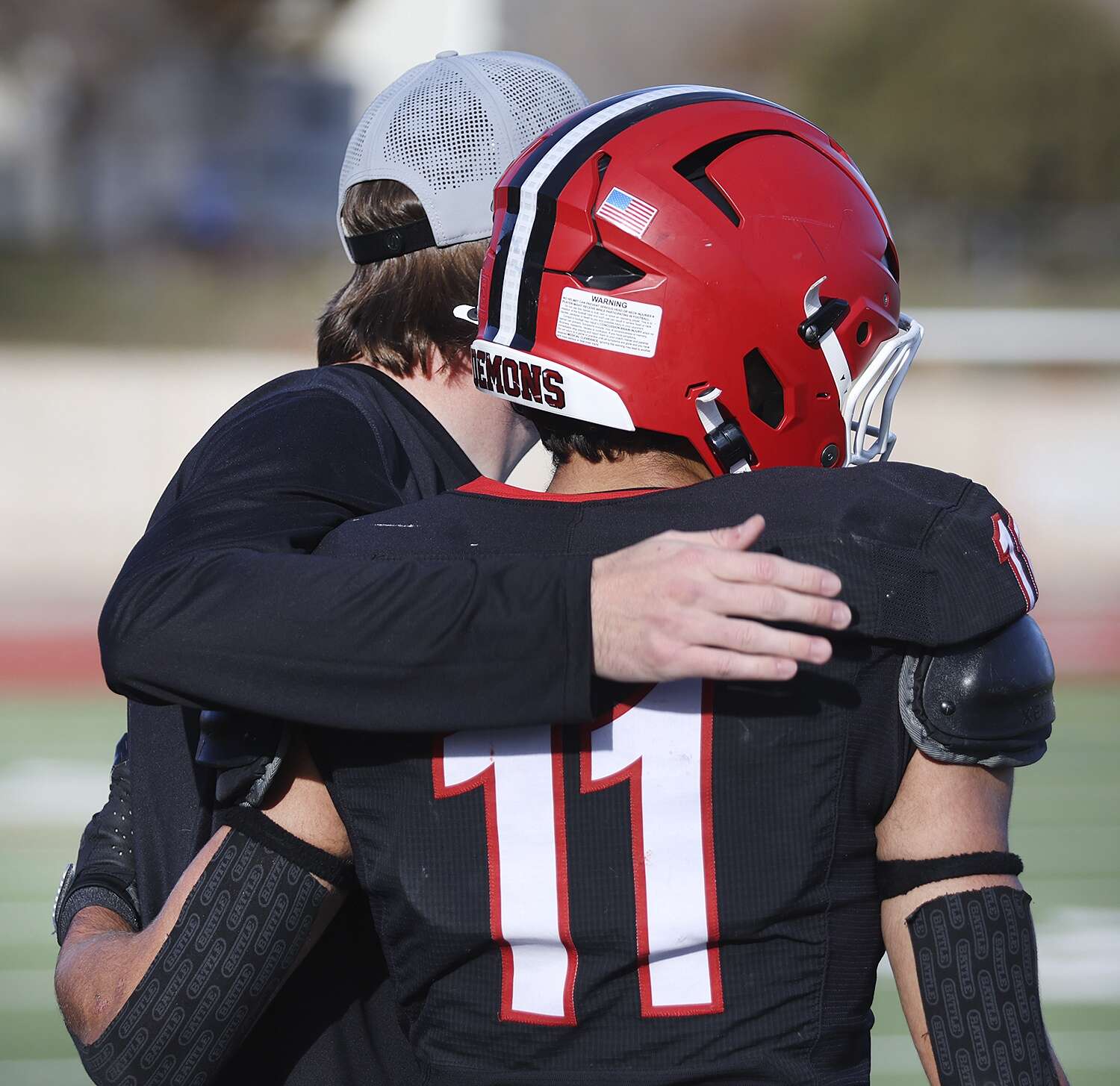 Durango High School football head coach Hunter Holmes consoles his player Sebastian Tripp as the state quarterfinals playoff game against Heritage High School comes to an end on Saturday, with DHS losing at home. (Jerry McBride/Durango Herald)