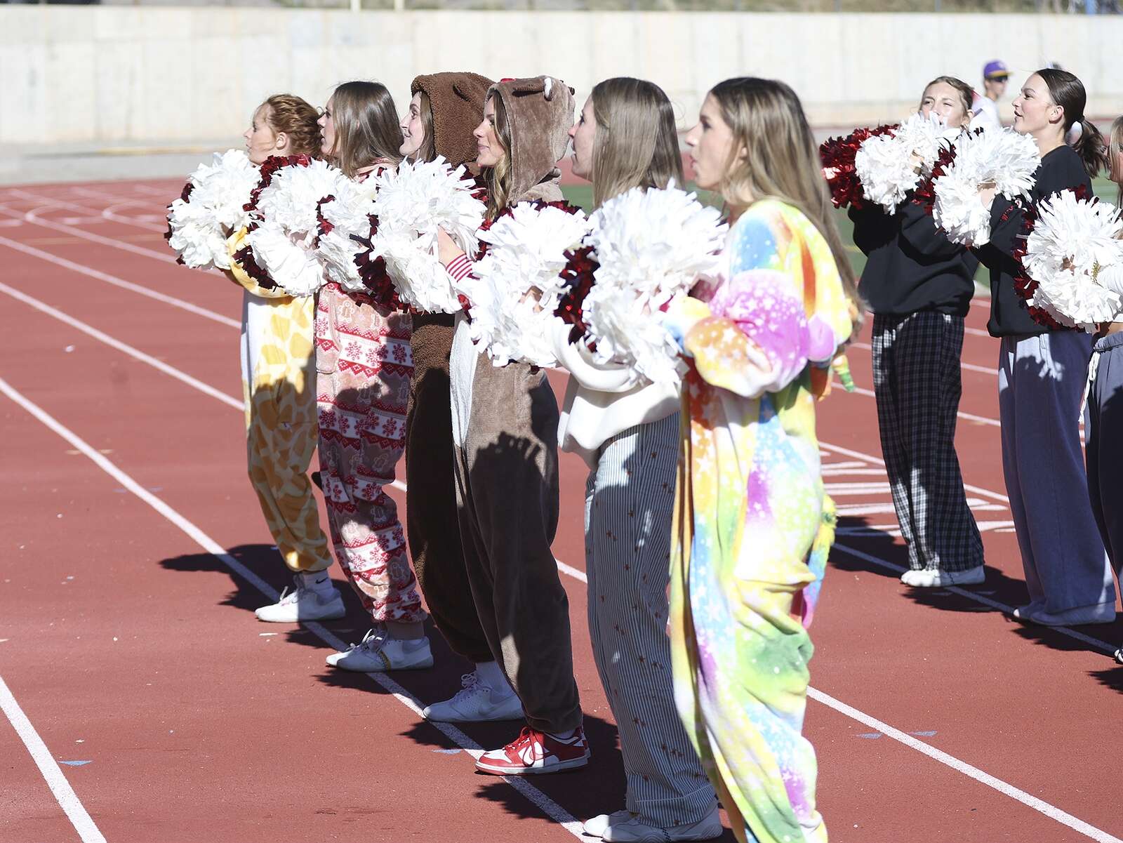 Durango High School cheerleaders stand on the sidelines during the Heritage High School state quarterfinals playoff game on Saturday at DHS. (Jerry McBride/Durango Herald)