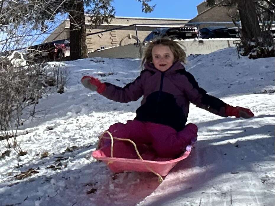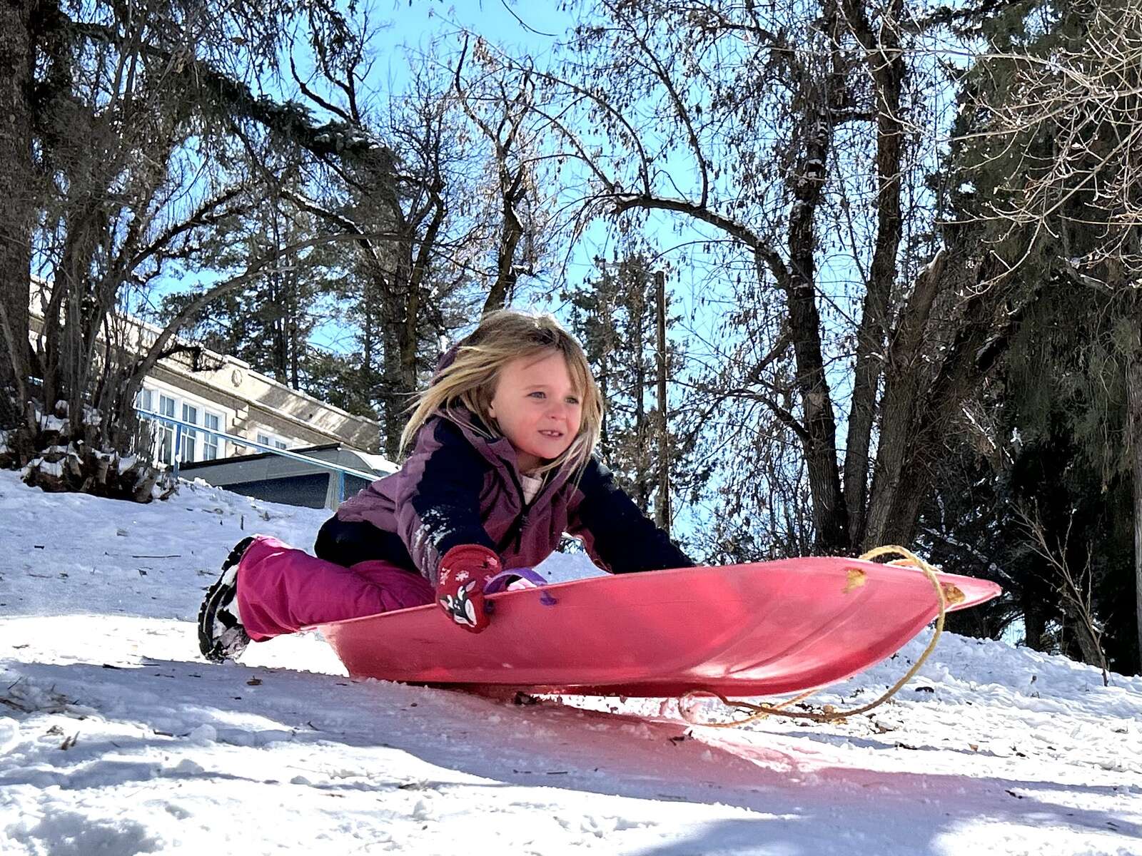 Sierra Stransky, 6, flies down the sledding hill Thursday at Buckley Park in Durango. Sierra is the daughter of Allegra Stransky. (Shane Benjamin/Durango Herald)