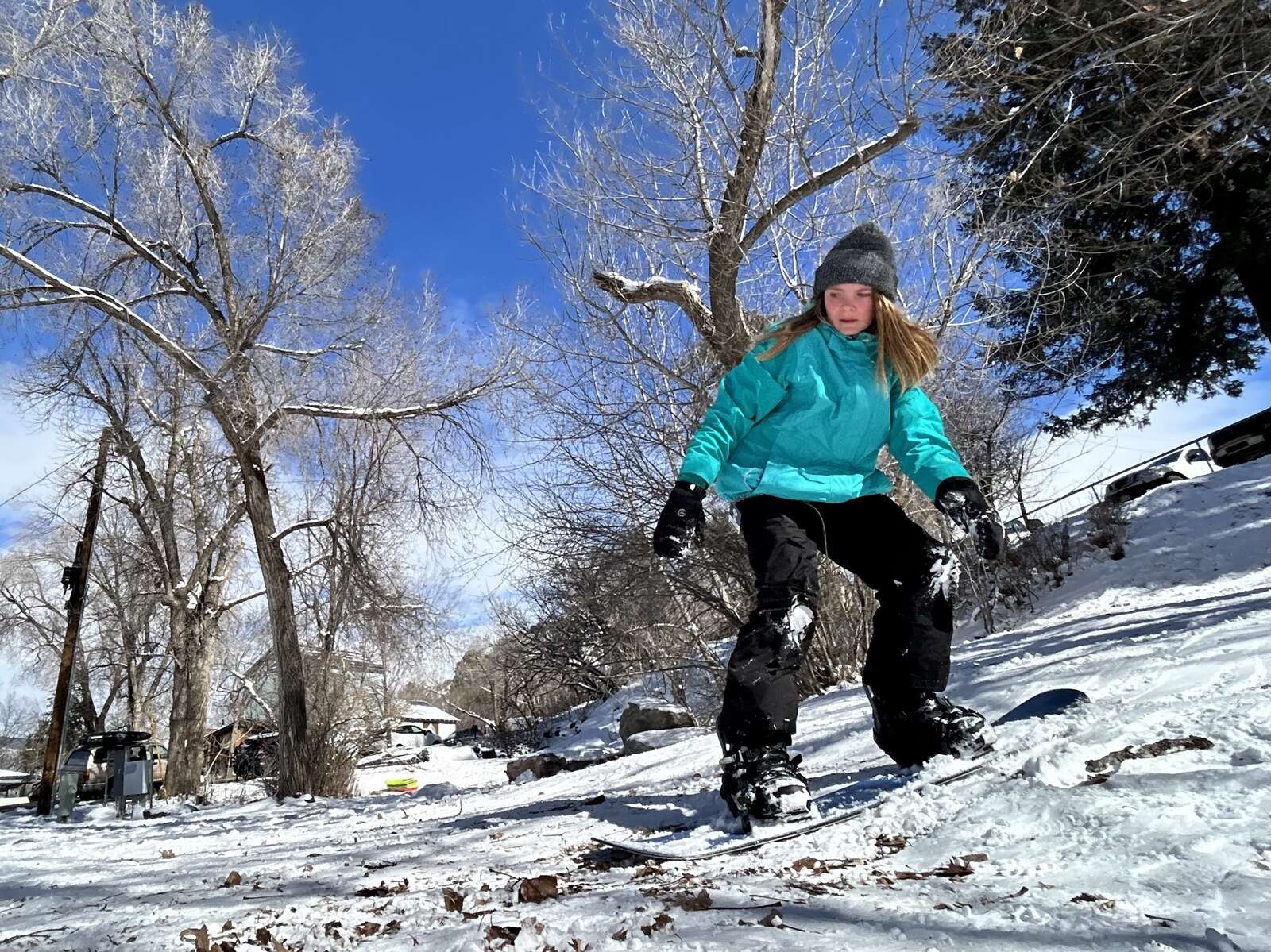 Elijah Conradi, 11, tries out his new snowboard Thursday at Buckley Park. Elijah is the son of Jyoti Conradi. (Shane Benjamin/Durango Herald)