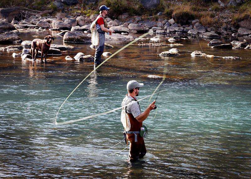 Marlin Boyer, front, and Mike Schmidt with his dog, George, take advantage of a beautiful Friday afternoon to fly-fish the Animas River near 28th Street. The weekend will bring more excellent weather for fishing. The National Weather Service forecasts a high of 61 on Saturday and Sunday with mostly sunny skies.