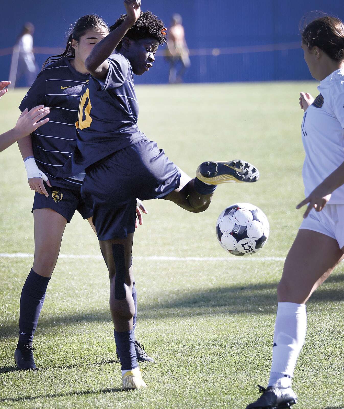 Abigail Nkrumah of Fort Lewis College takes control of the ball while playing Regis University on Sunday during the Rocky Mountain Athletic Conference tournament at FLC. (Jerry McBride/Durango Herald)