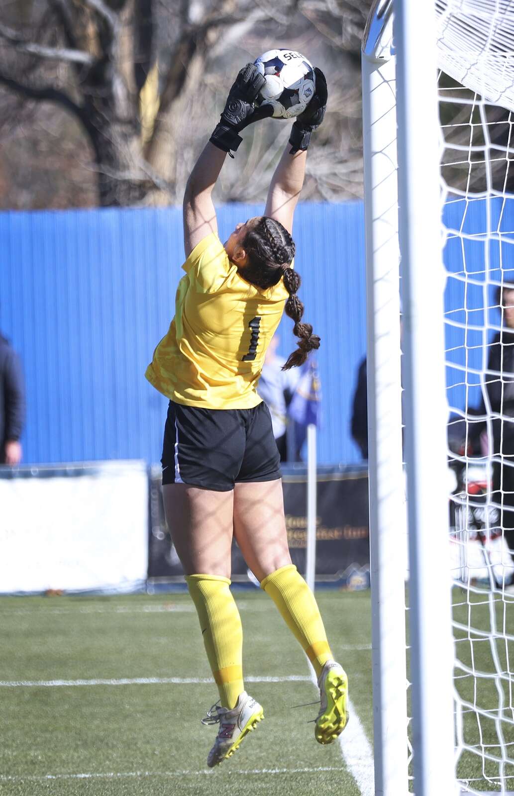 Fort Lewis College goalie Trinity Lujan makes a stop while playing Regis University on Sunday during the Rocky Mountain Athletic Conference tournament at FLC. (Jerry McBride/Durango Herald)