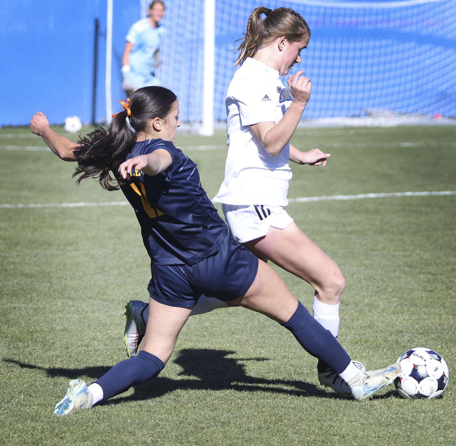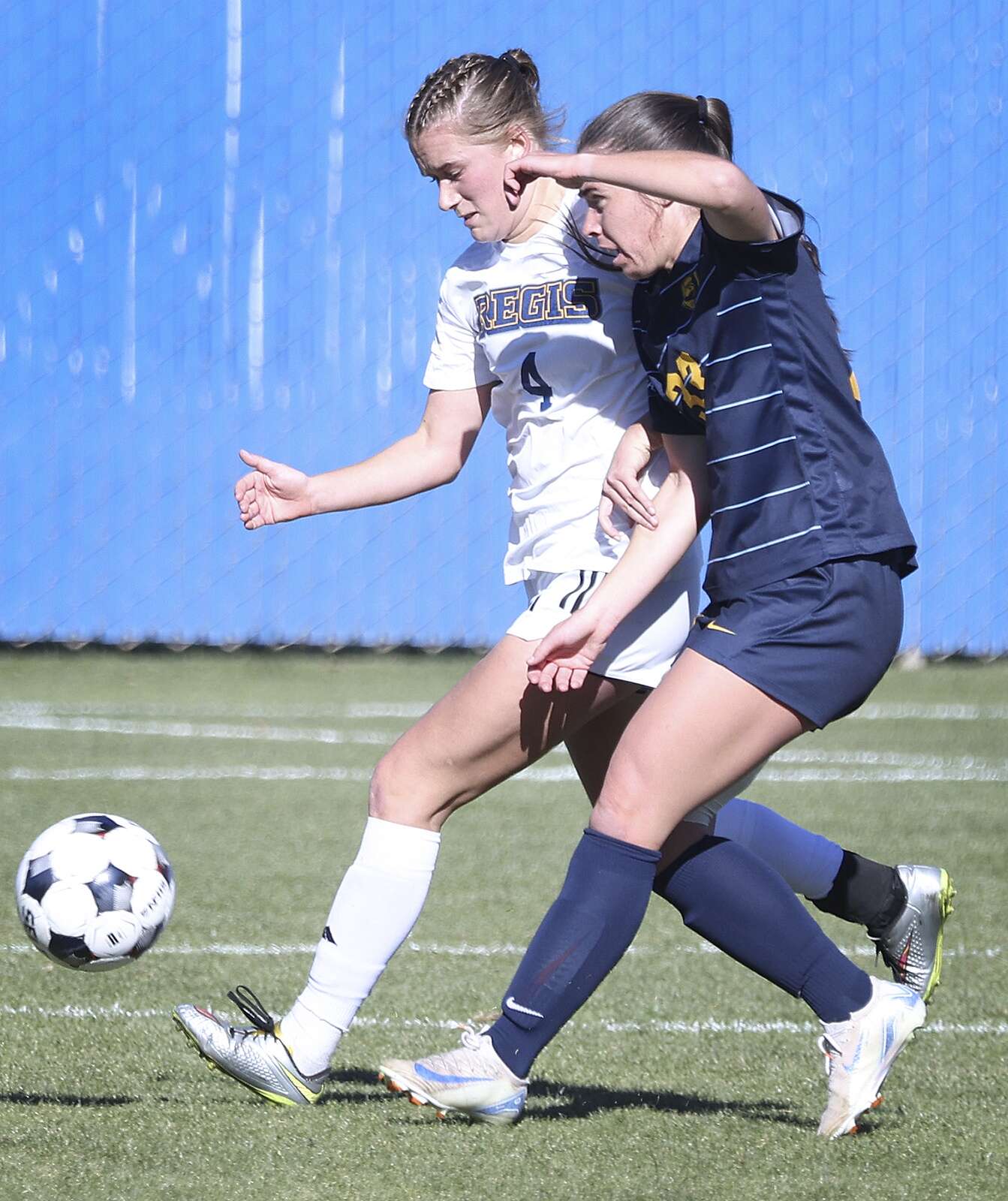 Josie Coulter of Fort Lewis College fights for the ball while playing Regis University on Sunday during the Rocky Mountain Athletic Conference tournament at FLC. (Jerry McBride/Durango Herald)