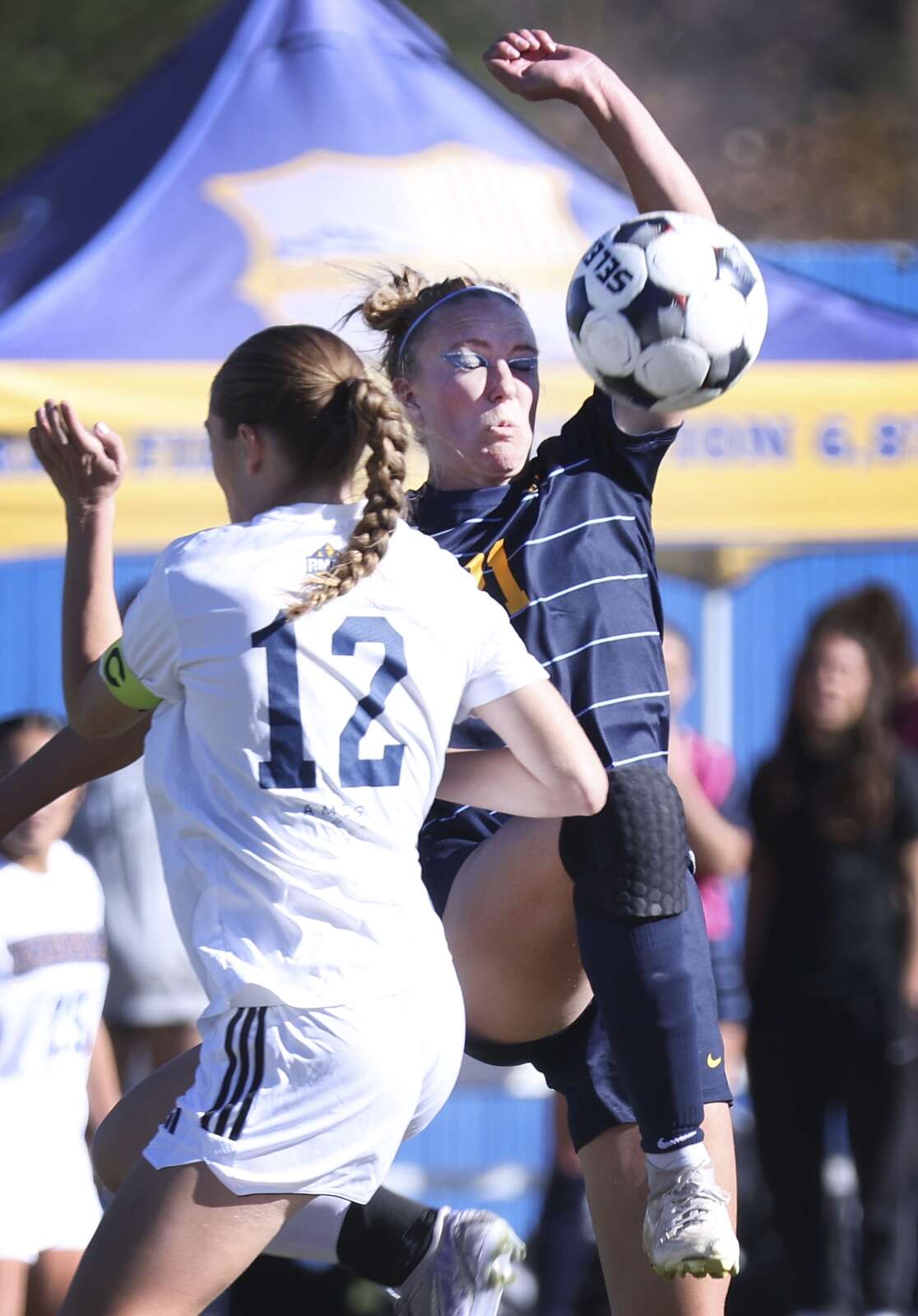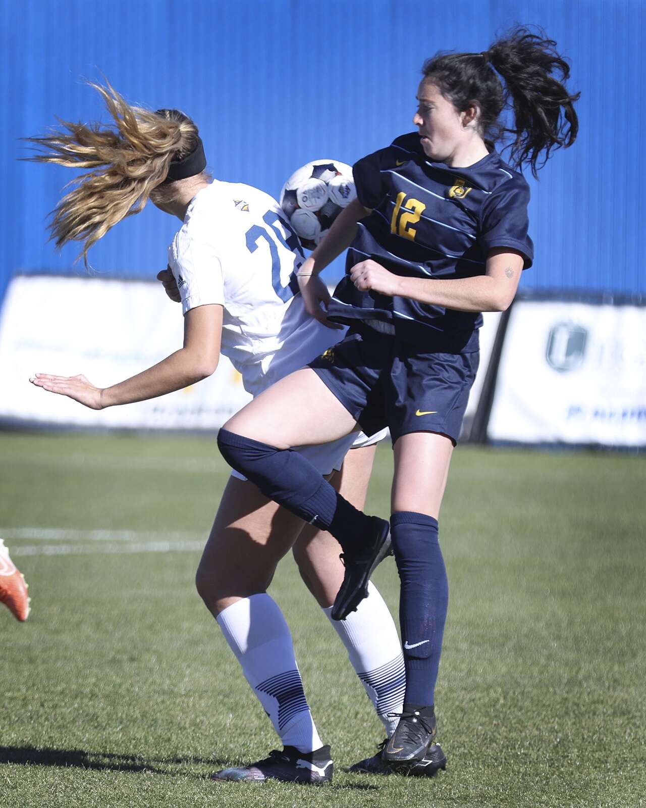 Renee Junna of Fort Lewis College heads the ball while playing Regis University on Sunday during the Rocky Mountain Athletic Conference tournament at FLC. (Jerry McBride/Durango Herald)